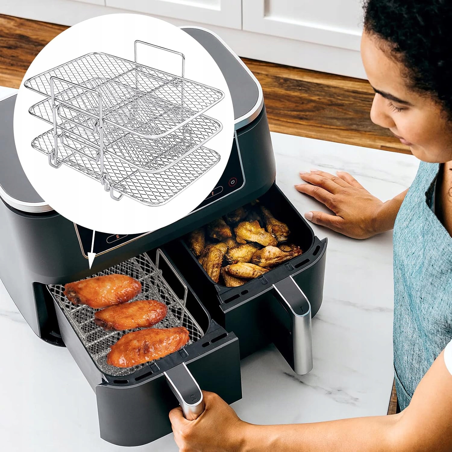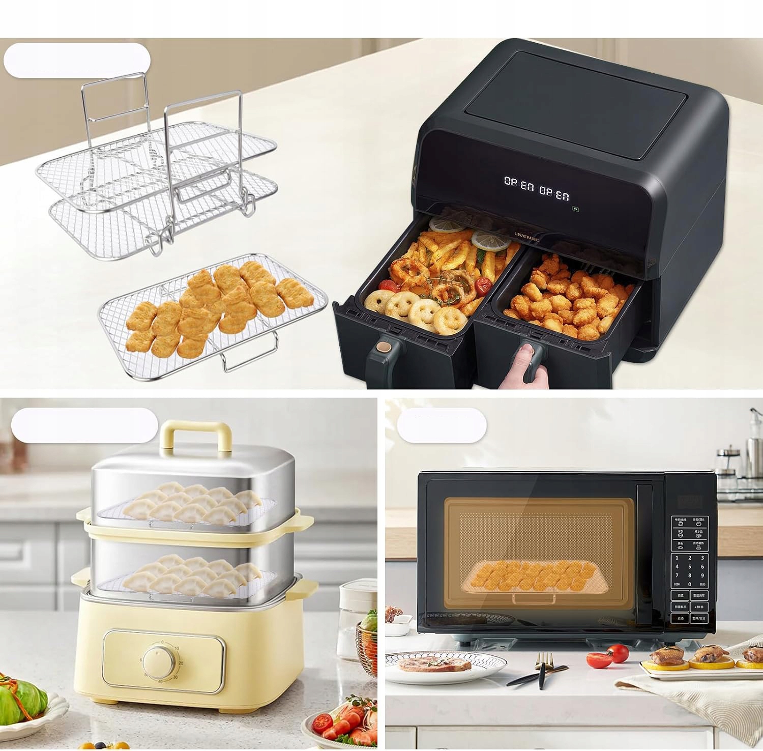 💎💎 При повному використанні простору: Розроблений з трьома шарами місця для розміщення їжі, збільшуючи ємність повітря -фриджа та дозволяючи приготувати більше продуктів одночасно, не торкаючись їх. Дизайн сітки забезпечує оптимальну циркуляцію повітря, завдяки якій їжі стає більш хрусткою.
