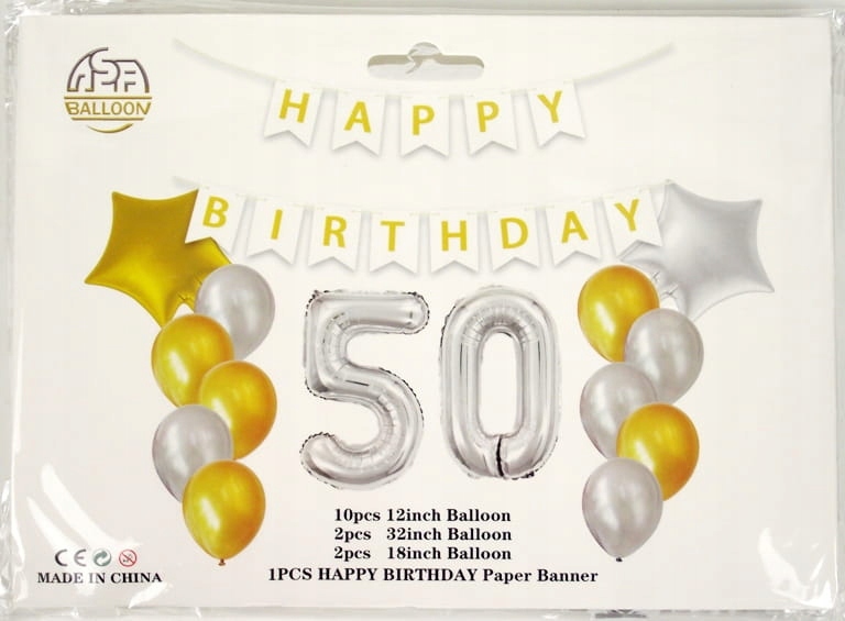 Набір включає 2 фольговані повітряні кулі розміром 80 см, 2 фольговані повітряні кульки розміром 45 см, 10 латексних повітряних куль розміром 30 см і 1 банер до дня народження.