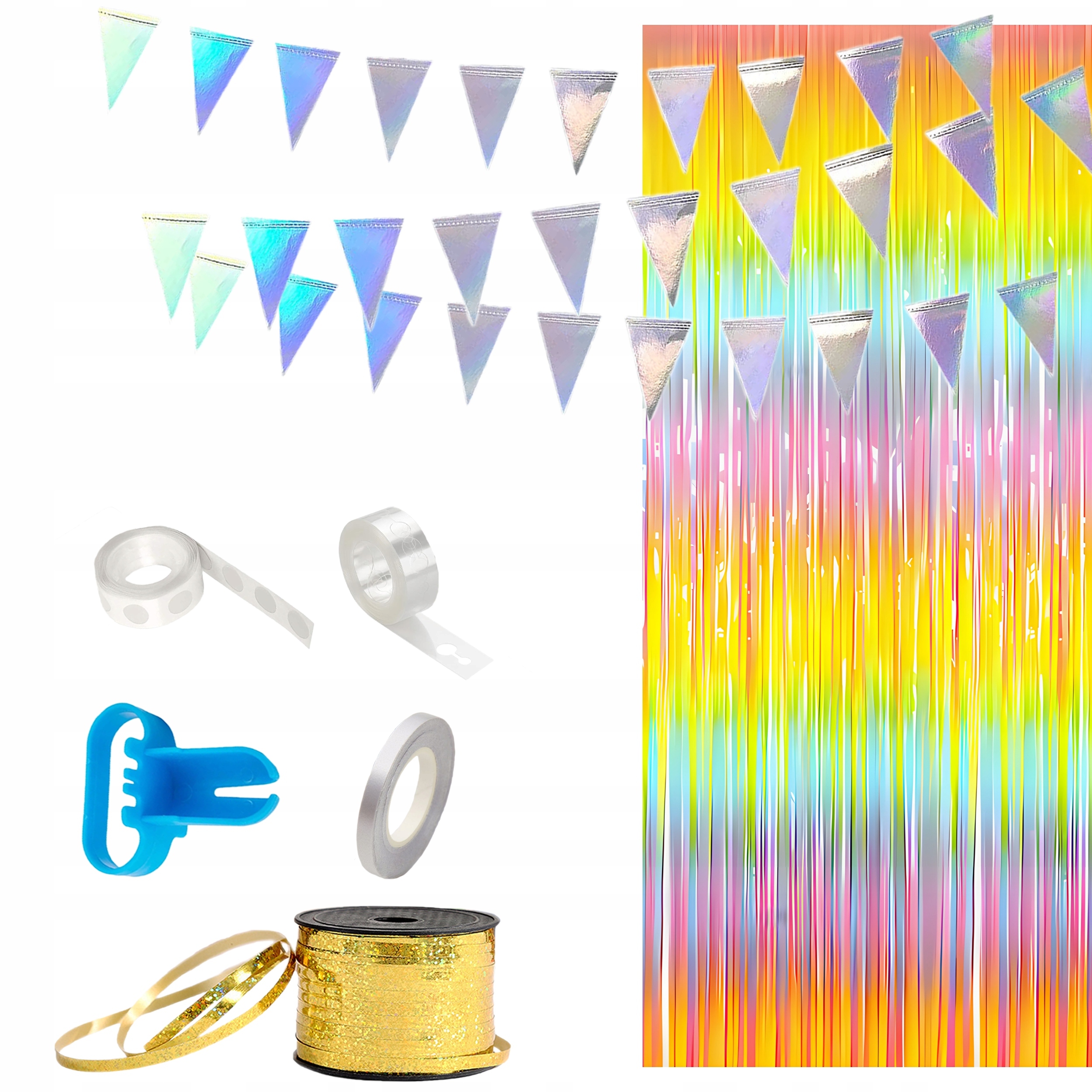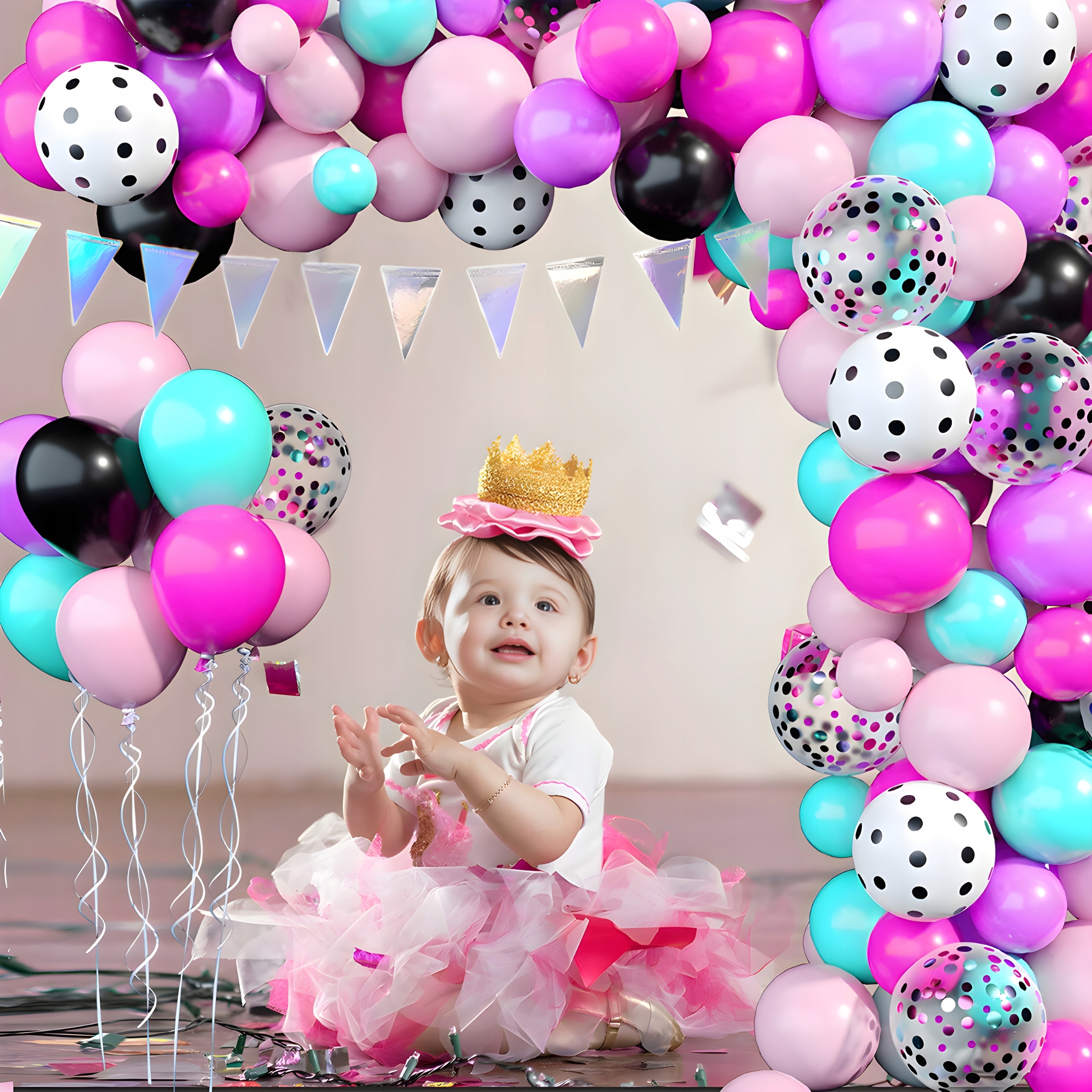 Ідеальним вибором буде наш спеціально складений набір, який виділяється серед конкурентів різноманітністю кольорів і багатою фурнітурою. Він пропонує не лише 7 різних типів повітряних куль, а й унікальні прикраси, такі як різнокольорові штори, декоративні трикутники та золотиста блискуча стрічка.