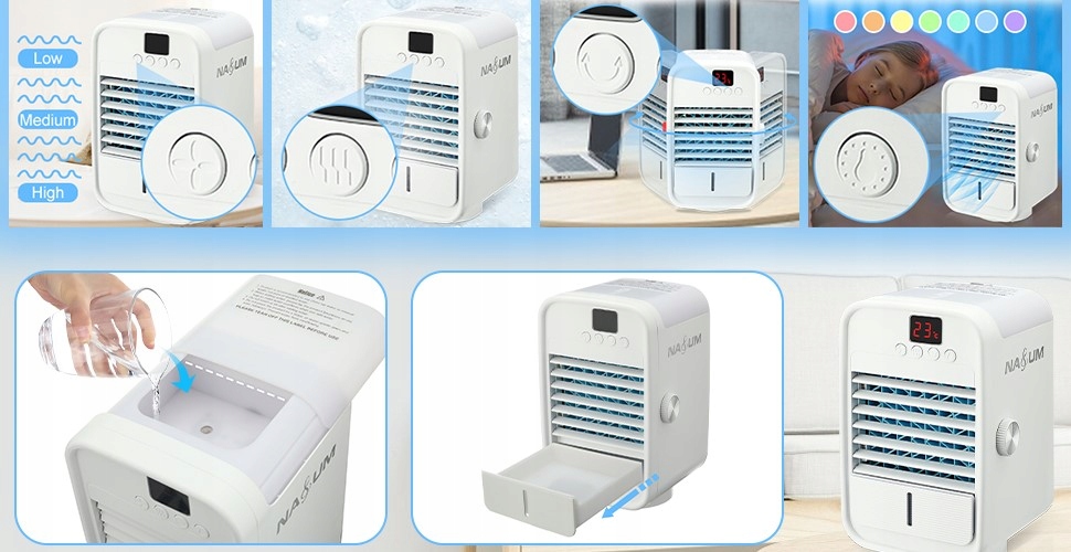 не лише особистий кондиціонер повітря, але й фанат, вологий і повітряний пристосування. Наш повітряний охолоджувач Eraser покращує очищення повітря та забезпечує сильніший вітер від повітряного радіатора, забезпечуючи набагато освіжаючий досвід. Функція освітлення радіатора нічного повітря може не тільки створити романтичну атмосферу, але й допомогти в кращому сні. 4 Ви можете вибрати найбільш підходящих для насолоди вільним, сном або робочим часом.