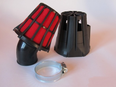 Дуже добре виготовлений повітряний фільтр, схожий на відомі фільтри від Revo, Polini або Malossi. Червоний губчастий фільтр з чорною кришкою. Фільтр із кутовим кріпленням 45 футів 38 мм (можна також встановити на карбюратори 35 мм, затягнувши хомут)