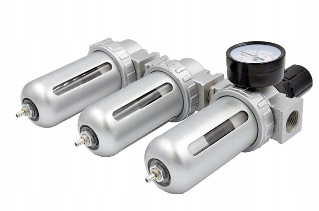 3-ступеневий повітряний фільтр/регулятор/дегідратор. Цей набір призначений для очищення вхідного повітря від більшості рідких і твердих часток. Регулятор тиску використовується для регулювання тиску вихлопного повітря в діапазоні від 0 до 150 psi.