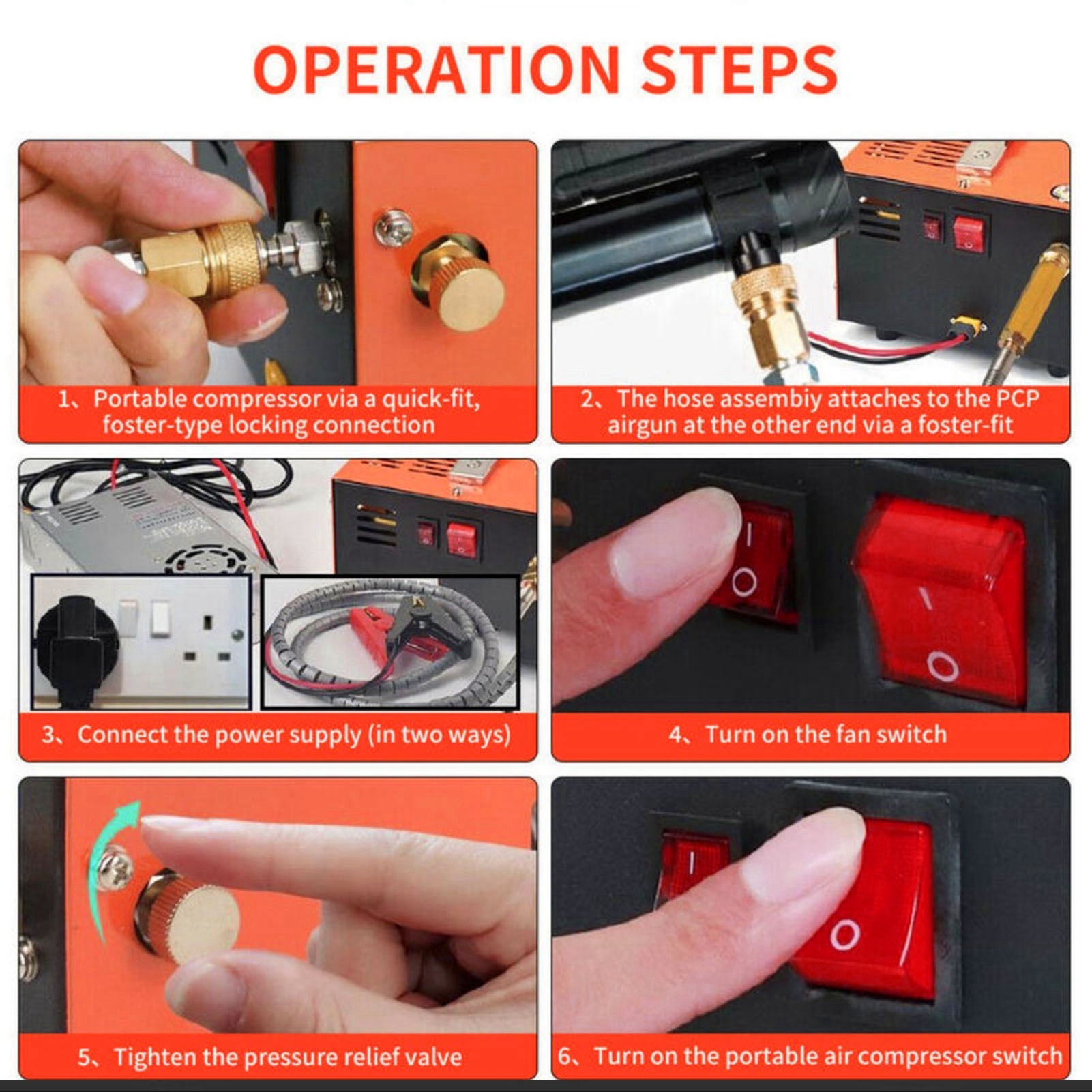 5. Широка сумісність: завдяки безщітковому двигуну потужністю 300 Вт він може забезпечувати тиск до 4500 psi, тобто 30 МПа. Підходить для дайвінгу, на відкритому повітрі, пожежогасіння, накачування PCP тощо. Від 0 до 300 бар компресору потрібно приблизно 25 хвилин, щоб заповнити резервуар 0,5 л, а від 200 бар до 300 бар – 10 хвилин.
