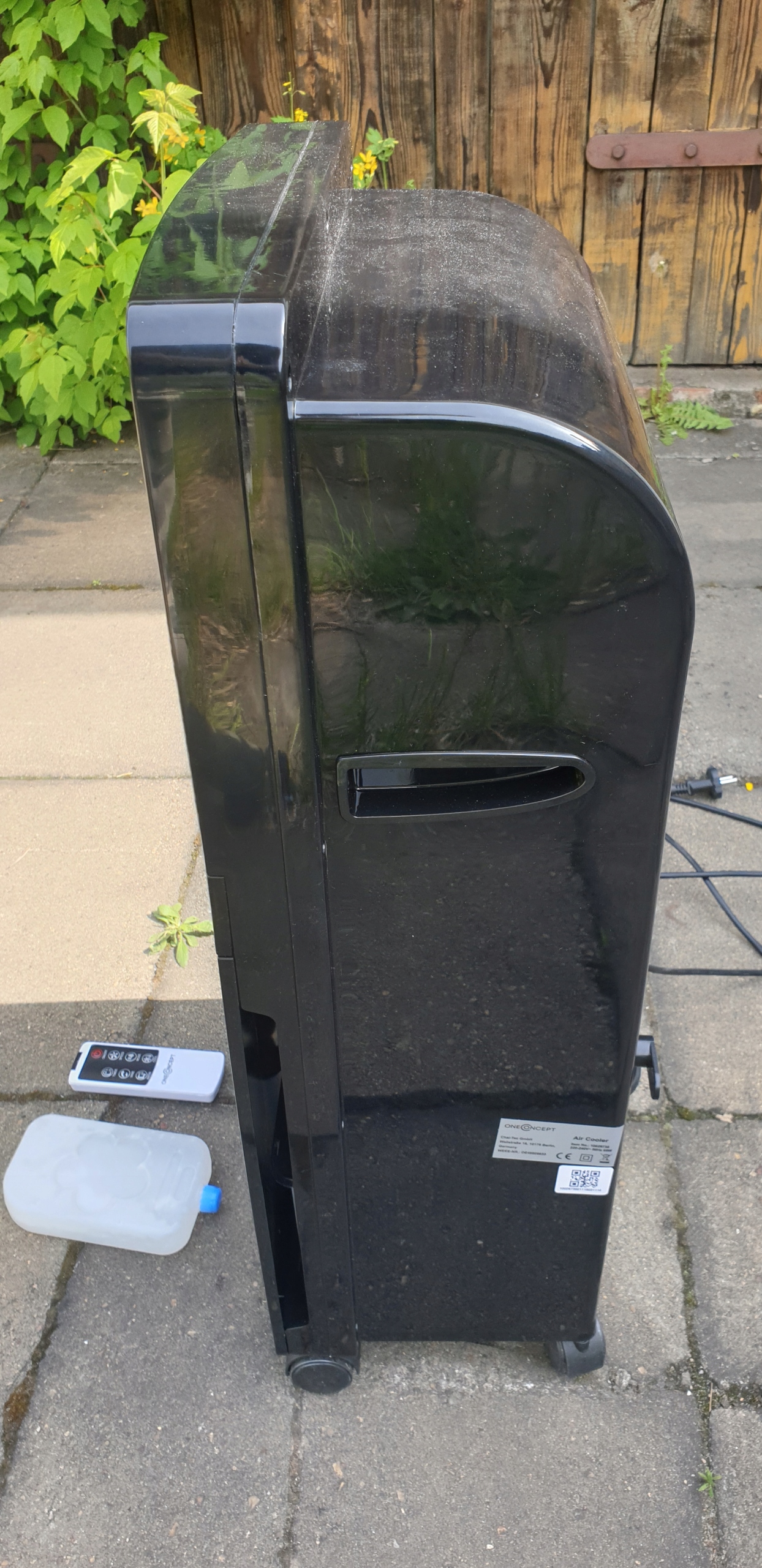 Пристрій можна керувати як всередині, так і зовні. Закриття вікон та дверей не потрібно. 4 Дві доставлені вставки для охолодження по черзі підтримують повітряне охолодження. Прикріплений пульт дистанційного керування дозволяє повний контроль над кулером із сидячого або лежачого положення, не підходячи до нього. Ідеальні умови для насолоди прохолодним вітерцем.