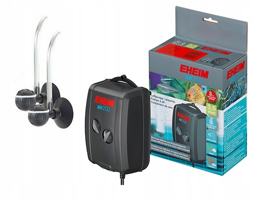 Air Pump 200 — це професійний повітряний насос (зумер) для прісноводних і морських акваріумів. Він оснащений двома регульованими повітряними отворами. Потік повітря можна регулювати в діапазоні 50-200 л/год завдяки регулятору, встановленому на корпусі аератора - кожен вихід має окреме регулювання. Гумові ніжки та крайки гасять вібрацію. Міцний корпус забезпечує дуже хорошу звукоізоляцію - Air Pump Eheim практично не чути. Підходить для широкого спектру застосування в акваріумі, наприклад