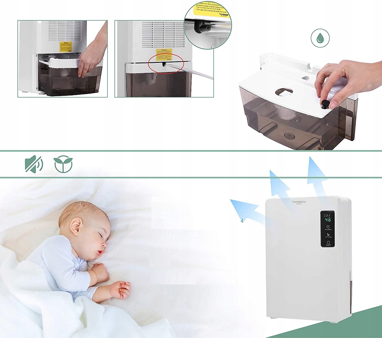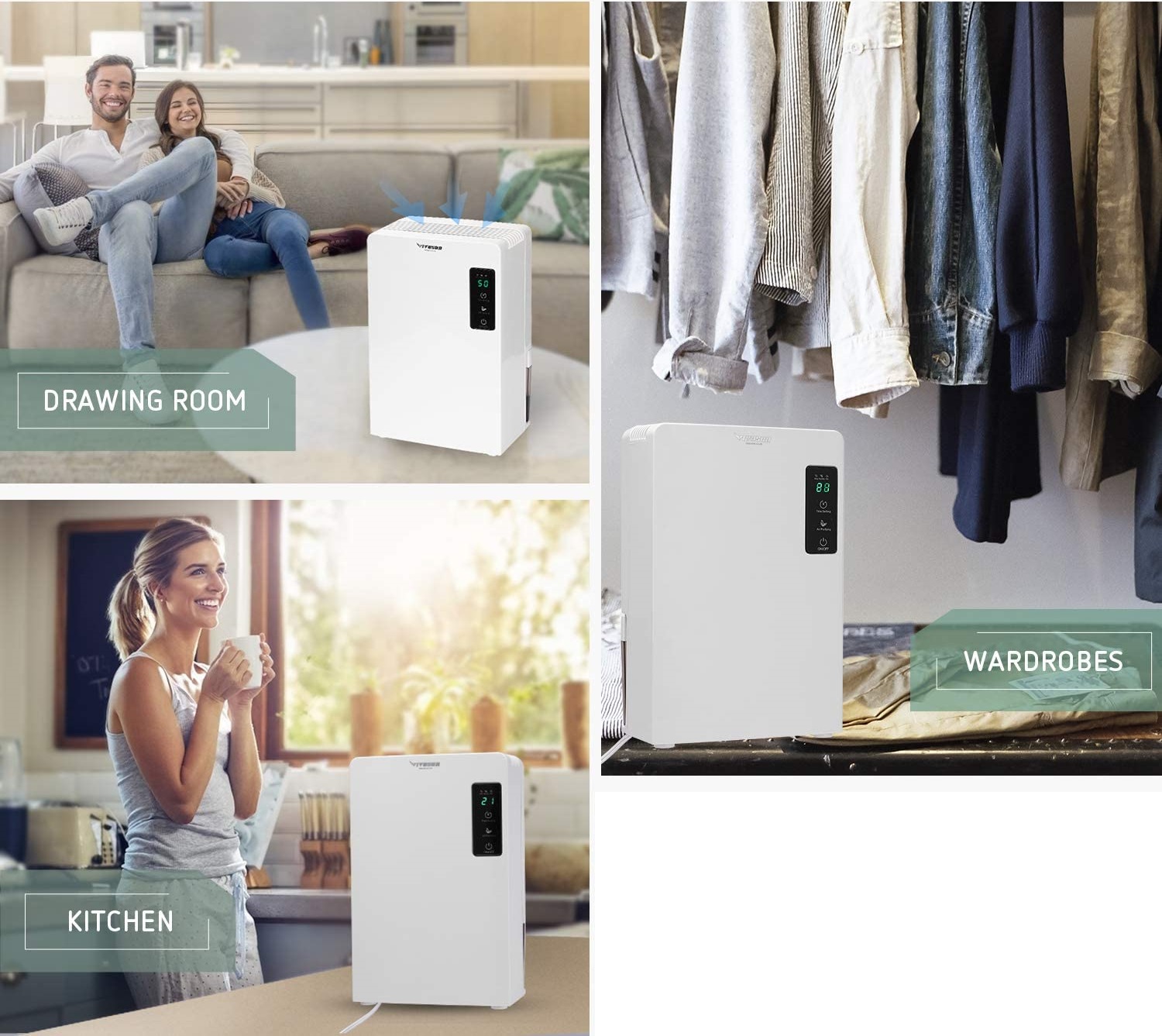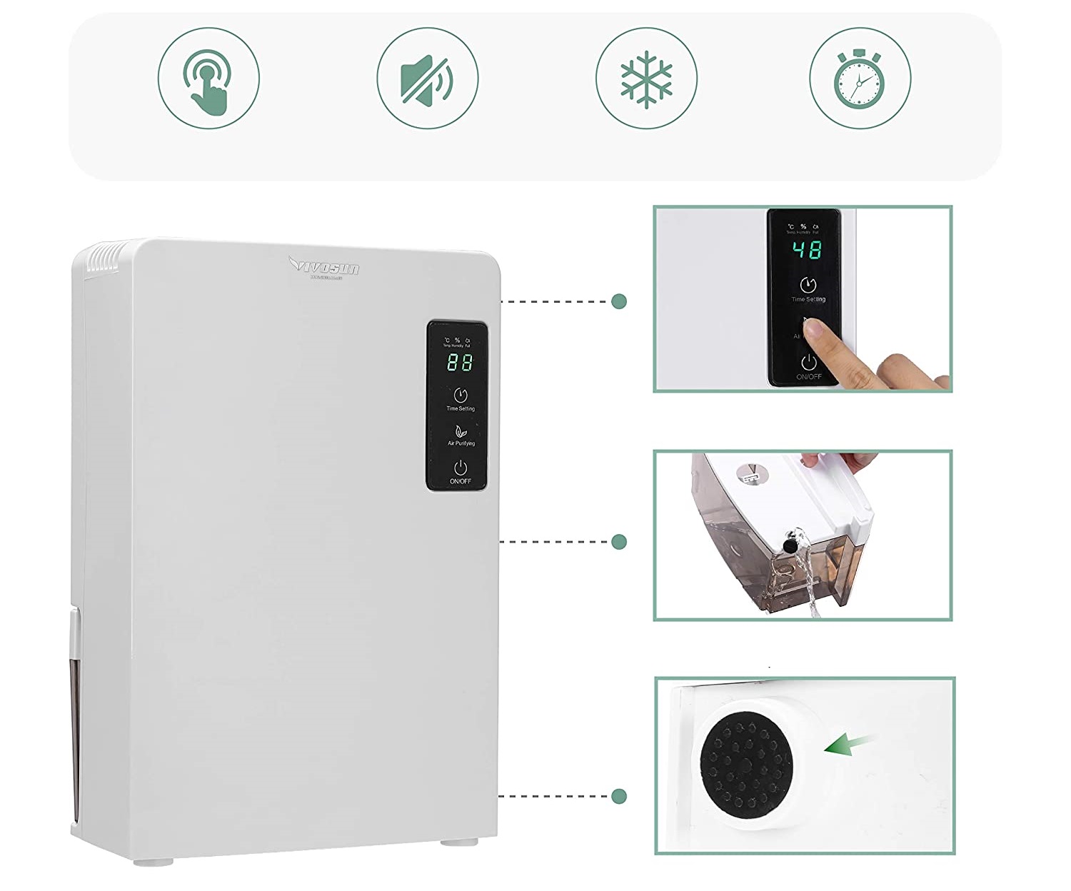 Повітряний осушувач має прозорий, легкий -для використання панелі керування з синім світлодіодним підсвічуванням. Завдяки побудованому термометрі та гігрометрі під час роботи він по черзі показує температуру поточної температури з поточною вологістю навколишнього повітря, в якому він знаходиться.