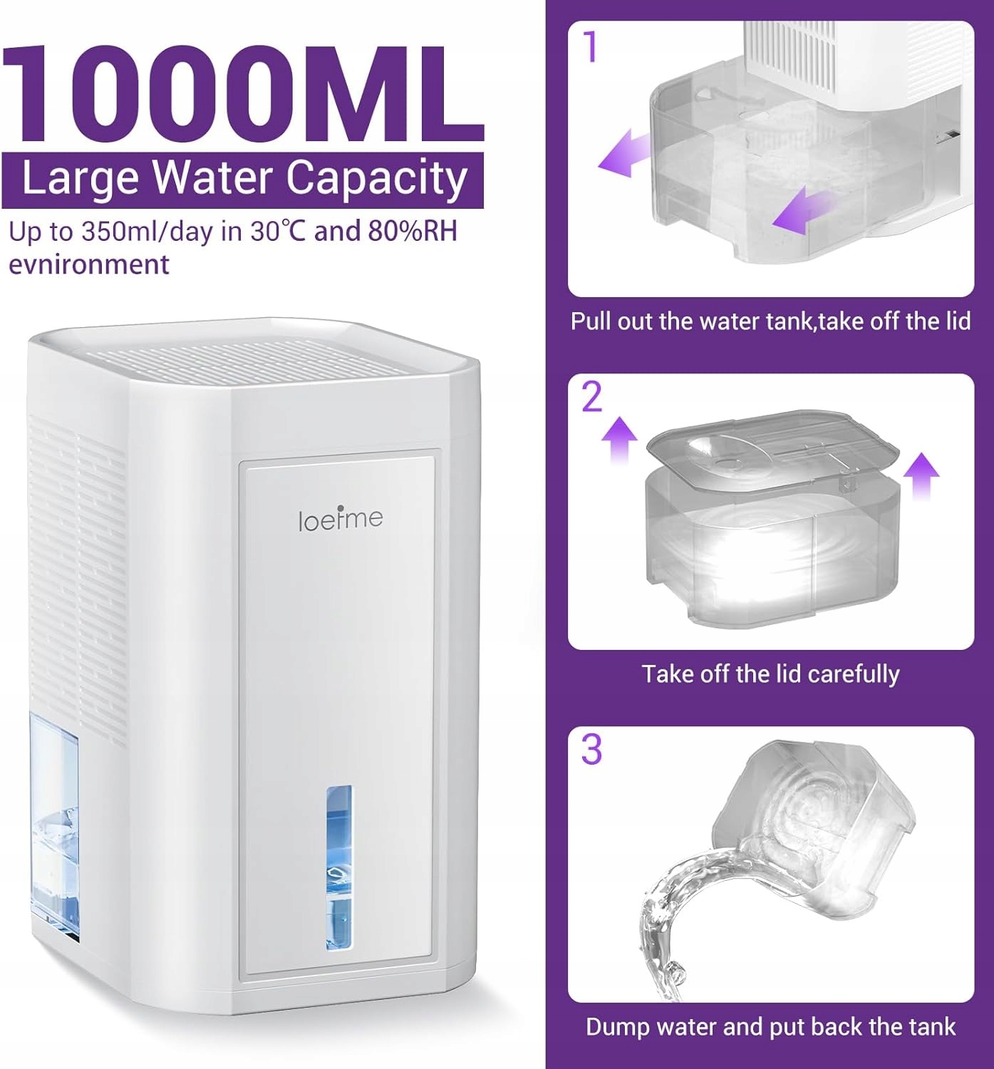 Просунута осушувач з потужністю 1000 мл ефективно і швидко видаляє зайву вологу зсередини, забезпечуючи зручні умови життя. З добовою ємністю 300 мл у 30 ° С та 80% відносній вологості, пристрій ефективно знижує рівень вологи, створюючи сухий і свіжий простір.