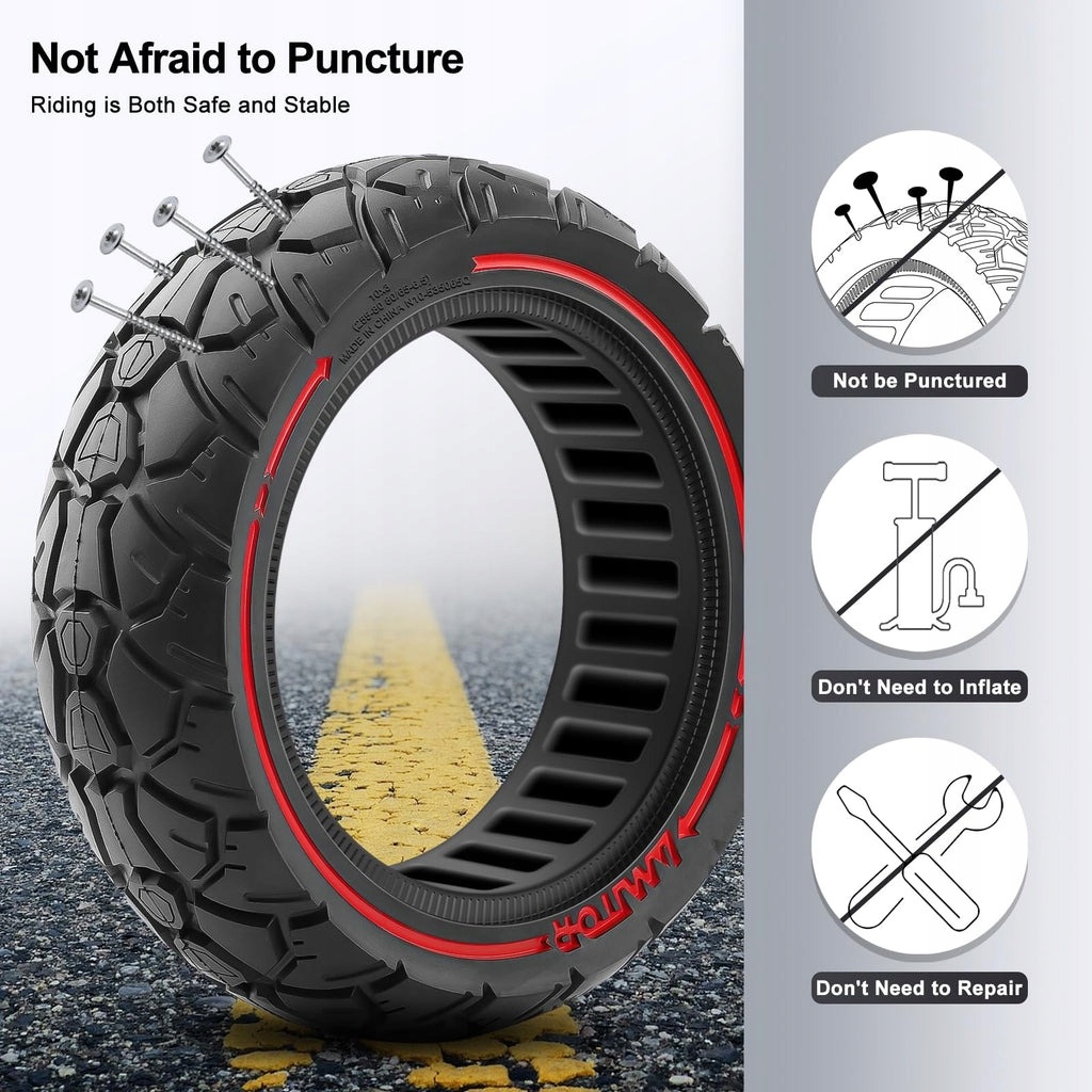- Стійка до проколів і довговічність: суцільні гумові шини Amitor 255 x 80 безкамерні, не пневматичні, не потребують обслуговування та прості у використанні. Гумовий матеріал є гнучким, а унікальна конструкція стільникового отвору зменшує зовнішні впливи, забезпечує довговічність, тривалий термін служби та не хвилюється про стійкість до проколів. З цією 10-дюймовою суцільногумовою шиною для електричного скутера вам більше не доведеться так часто міняти шини.