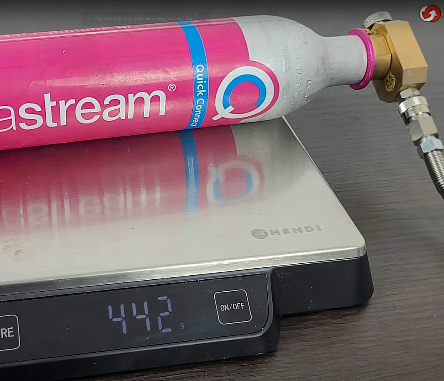 Манометр має лише інформативну функцію, він повідомляє перевірити, чи є тиск в установці чи ні, завдяки чому ми можемо безпечно вийняти картридж. Якщо ми хочемо знати, скільки CO2 міститься в балоні, ми повинні зважити його, коли він заповнений, а потім перевірити вагу. Рідкий вуглекислий газ становить 80% від маси всього вмісту балона, решта 20% - це діоксид газу. Коли в балоні залишається тільки діоксид у вигляді газу, ми впорскуємо макс. 50 г CO2.