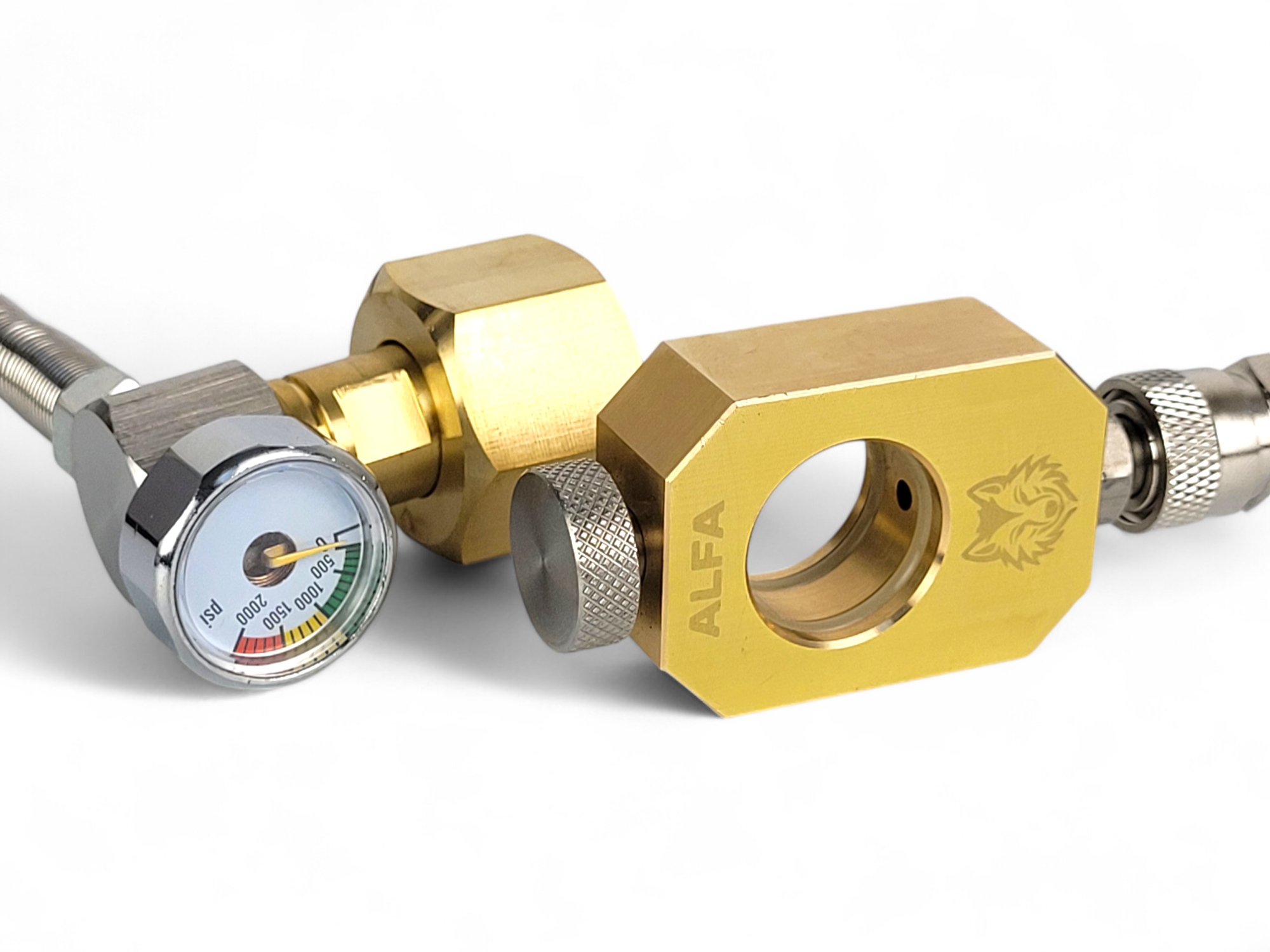 Шунт складається з двох елементів: перший являє собою гнучкий трубопровід з манометром довжиною 60 см, закінчений гніздовим з’єднувачем PCP 8 мм і вхідна різьба W21.8-1/14. Другий елемент – це шунт із роз’ємом Quick Connect, оснащеним роз’ємом PCP 8 мм, вентиляційним отвором і патронним замком.