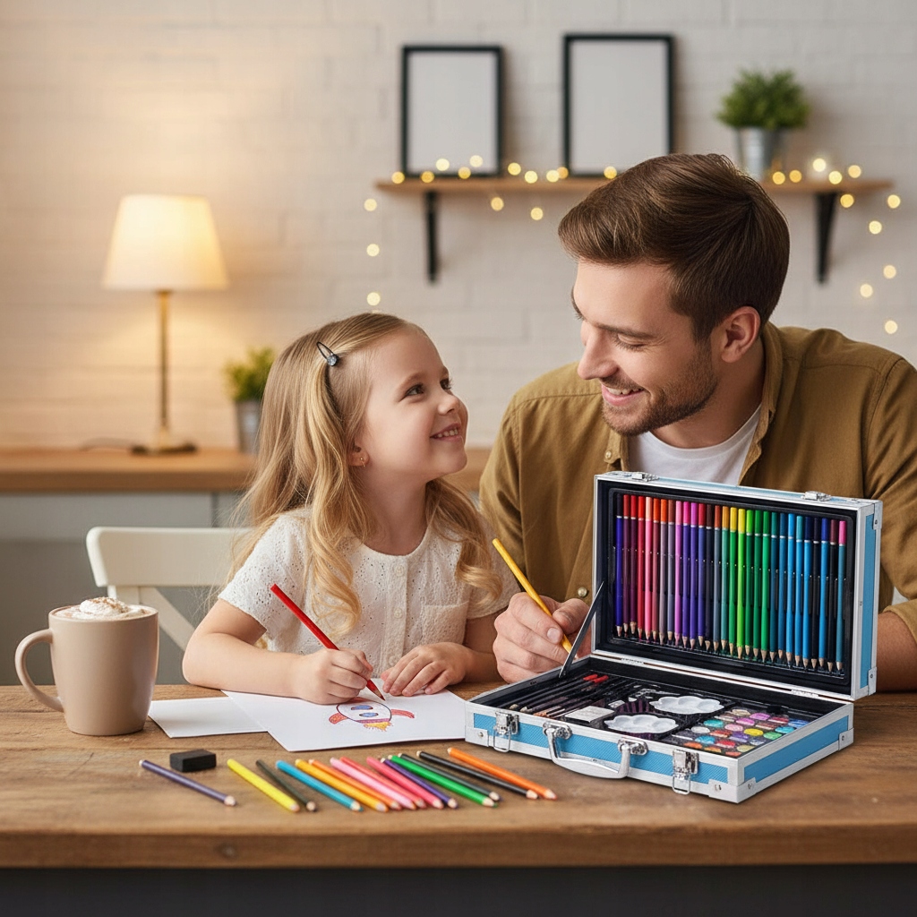 Повний художній набір із 145 предметів. Валіза, кольорові олівці, фарби, діти