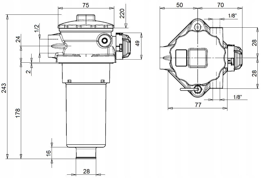 - Вихідний роз'єм із зовнішньою різьбою M22x1.5