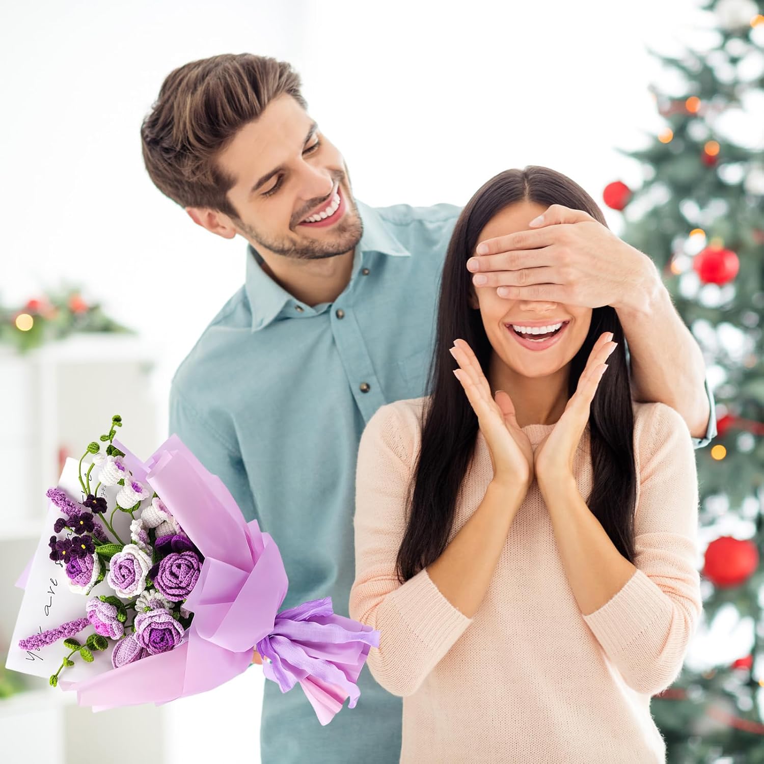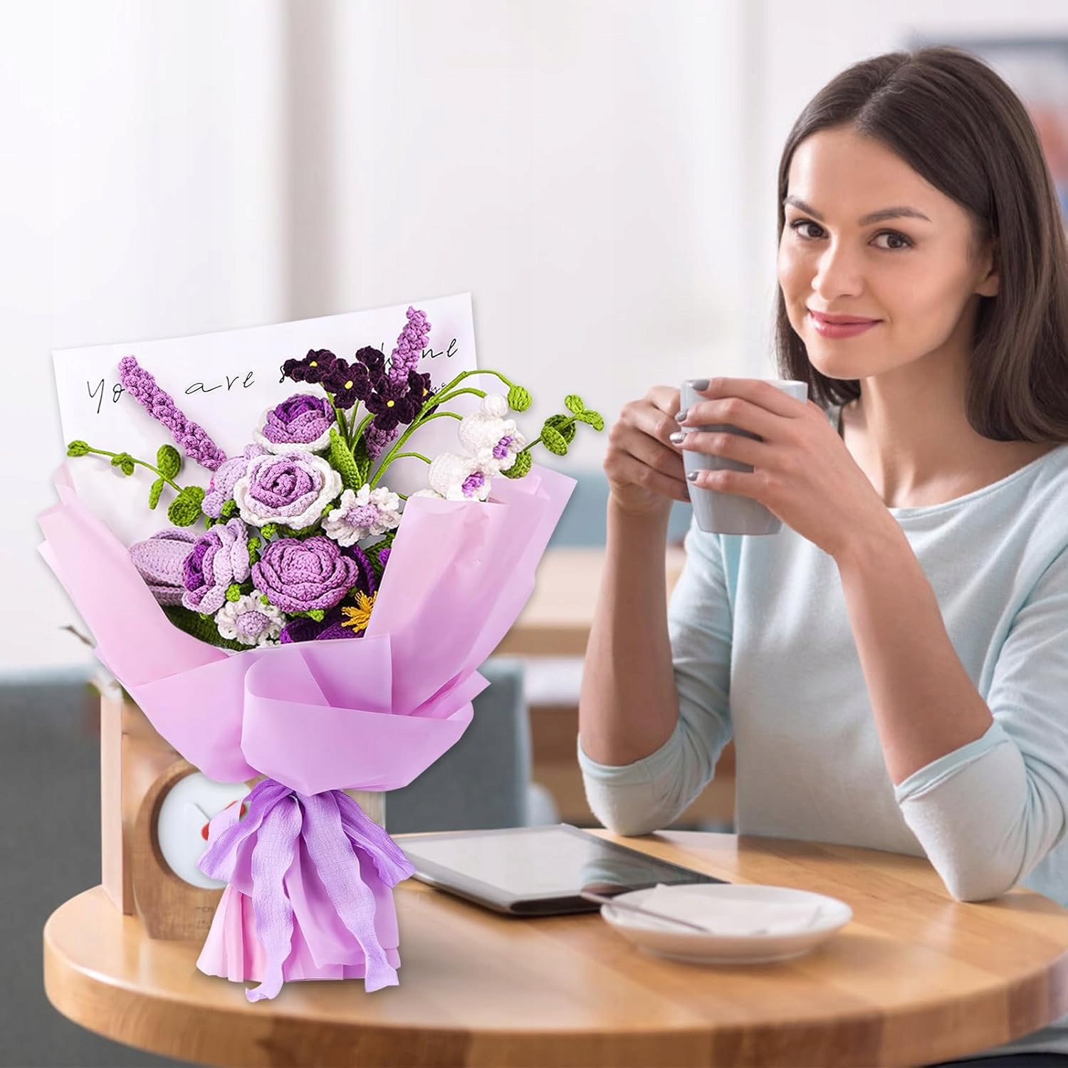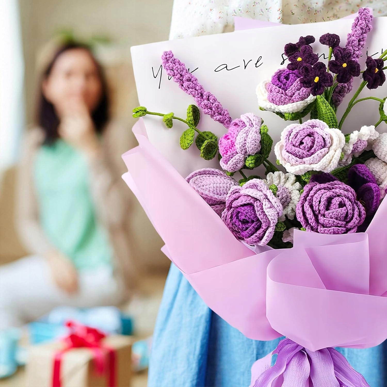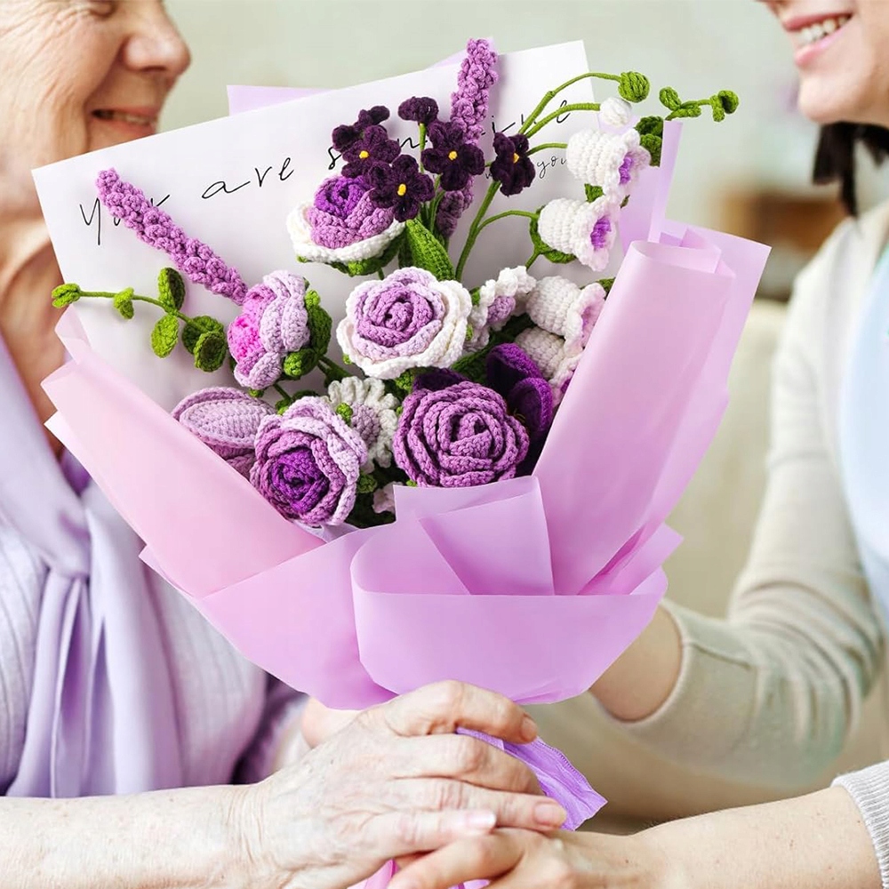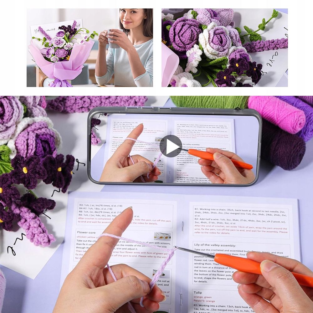 Цей набір букетів гачком включає все, що вам потрібно, щоб почати майструвати: 9 мотків ниток, 1 гачок для в’язання (2,5 мм), 10 маркерів для стібків, стрічку, обгортковий папір і докладну інструкцію з відеоуроками, які допоможуть вам навчання.