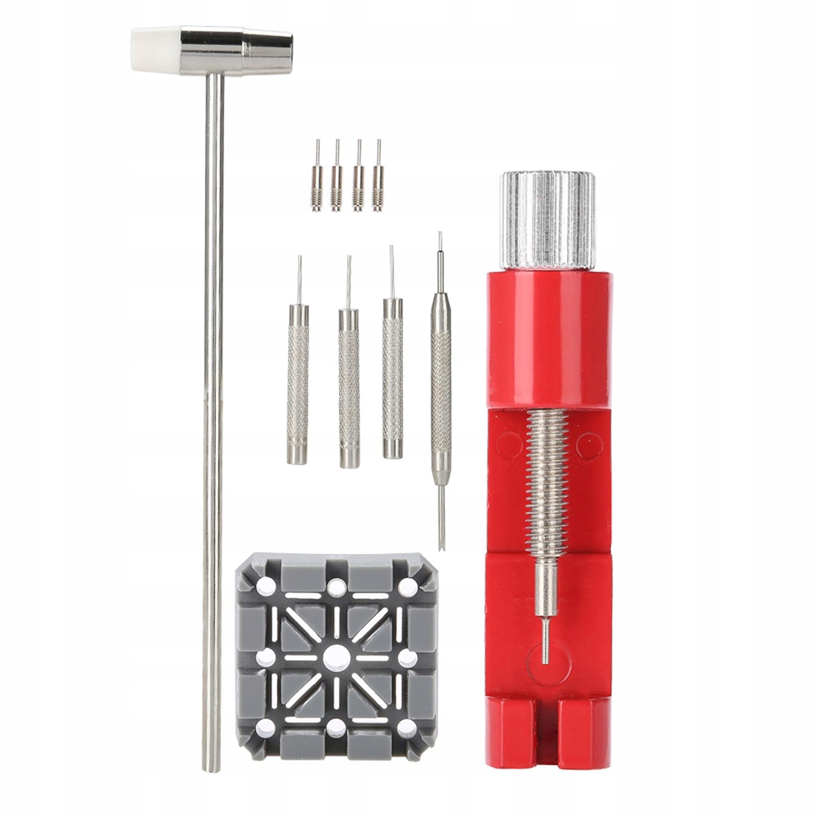 - Набір інструментів включає пристрій для зняття, 4 шпильки, планку для зняття ремінця, молоток, тримач для ремінця, а також пробійник для шпильки годинника.