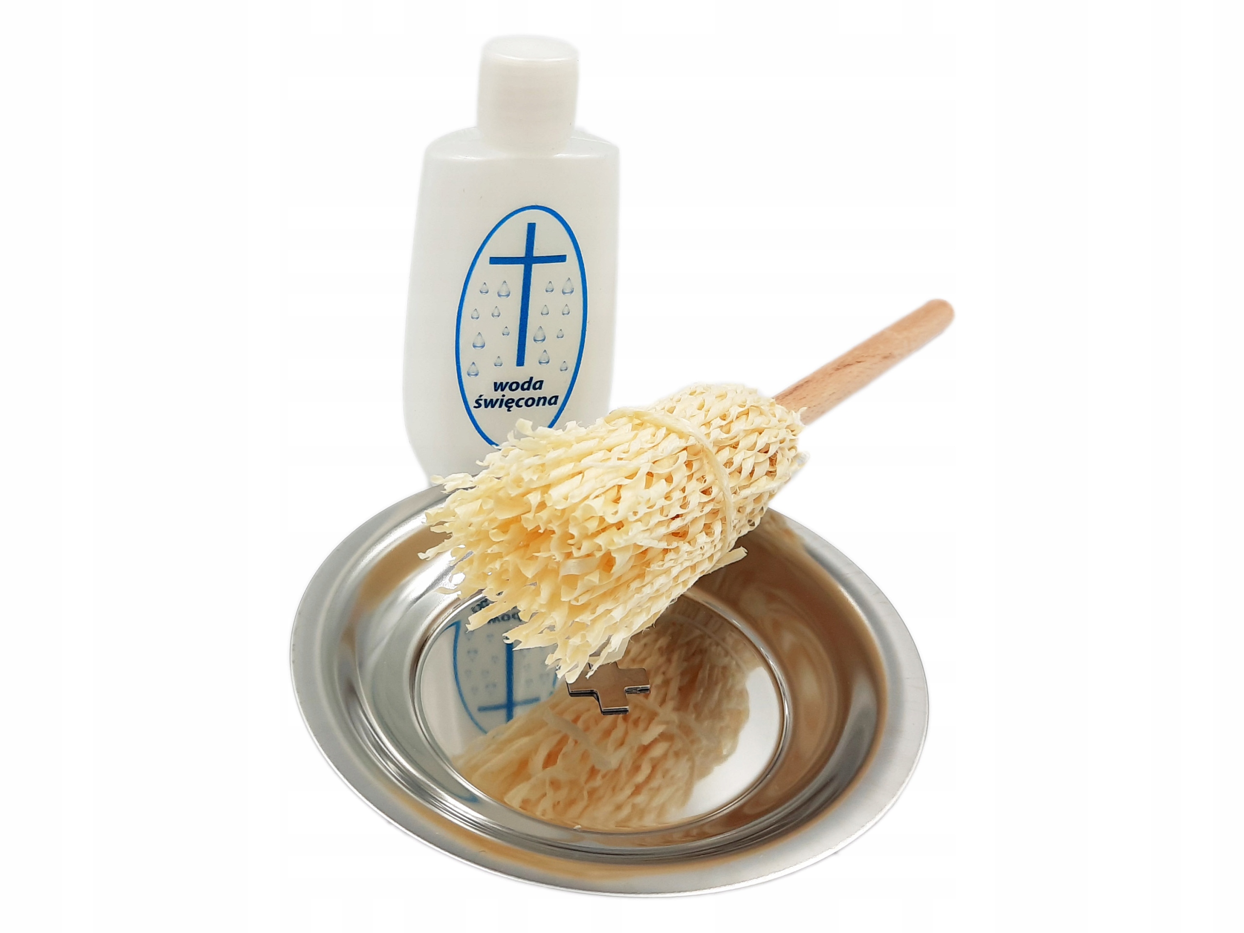 Додатково У набір входить металева чаша для свяченої води, дерев'яна щіпка для свячення та пляшка для свяченої води.
