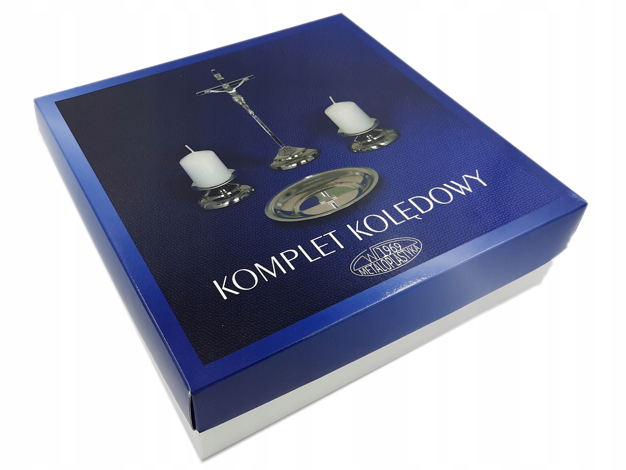 Набір найвищої якості для пастирського візиту. Стоячий хрест 19 см заввишки, 2 свічники для свічок з шипами та 2 білі свічки з шипами в тон свічникам.