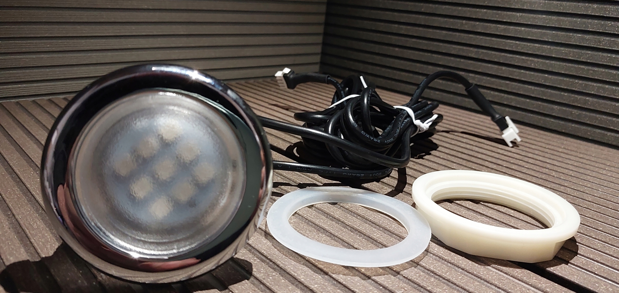 Лінза призначена для підводної установки, в комплекті з RGB світлодіодами, сенсорна кнопка з підсвічуванням для установки на спа-ванну/ванну, блок живлення.