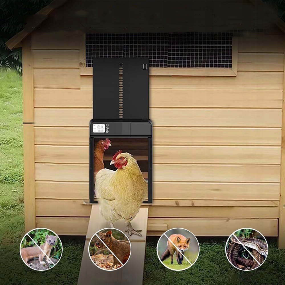 🐔🐔Робота в екстремальних погодних умовах:наші високоякісні автоматичні двері для курятника, виготовлені з міцного алюмінію, стійкі до корозії та витримують екстремальні погодні умови, водночас зберігаючи безпеку та захист ваших курей. p>