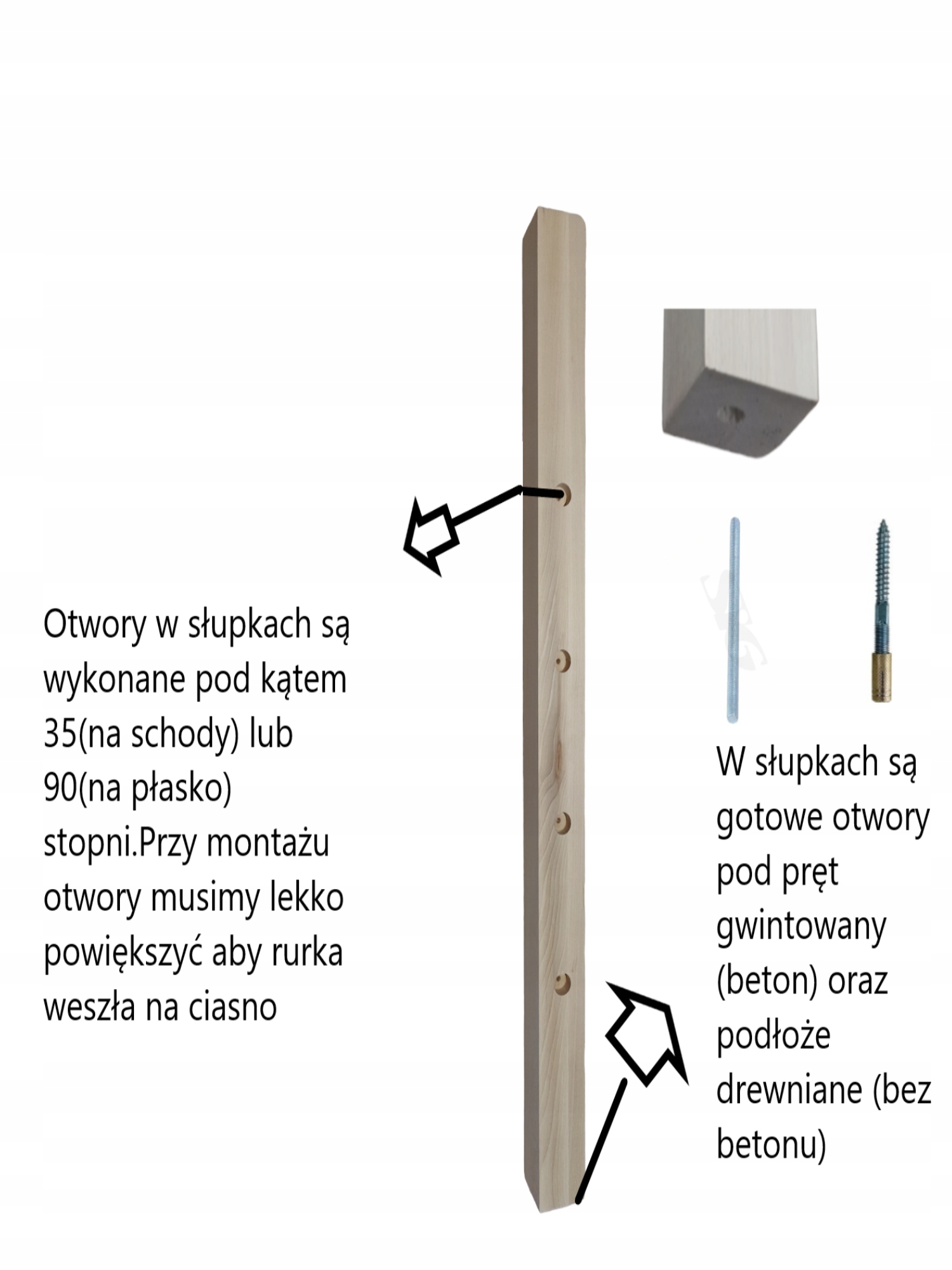 - у стовпах просвердлені отвори для сталевих труб і додатковий отвір внизу для кріплення балюстради до бетонну або дерев’яну підлогу