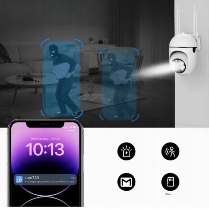 Завдяки інтелектуальному аналізу зображення камера автоматично виявляє рух і негайно надсилає сповіщення на ваш телефон. Це ідеальне рішення для захисту дітей, домашніх тварин або майна під час вашої відсутності.