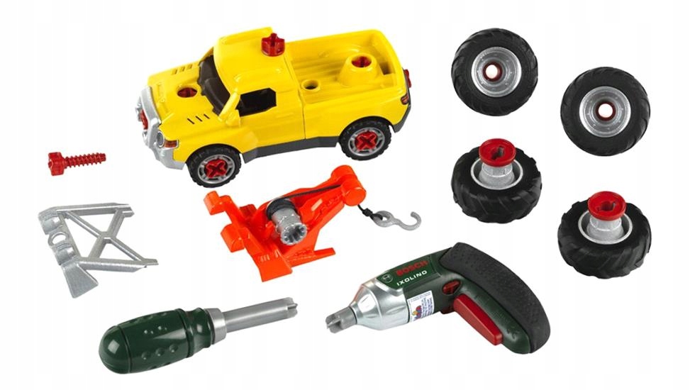 У набір входить автомобіль, деталі та акумуляторний шуруповерт Bosch (лівий/правий поворот). Чудова розвага для маленьких механіків. Потрібні батарейки (не входять в комплект). Це дозволить вашим дітям грати маленькими майстрами, наслідуючи роботу свого тата.