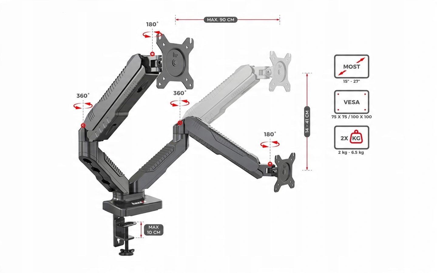 Рух 2.3 не тільки надає багато варіантів персоналізації для налаштувань. Ключовою функцією ручки є її стабільність та сила. кожна рука ручки безпечно зловитиме монітор до 6,5 кг. Після повішення монітора служитимуть протягом багатьох місяців. Ми знаємо, що ваші монітори - це дороге і цінне обладнання, саме тому наша ручка вперше гарантує її безпеку.