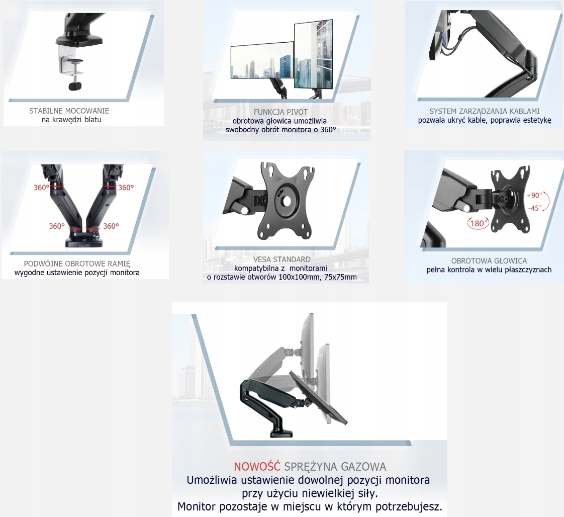 - Вбудована -в газовій пружині дозволяє (навіть один палець) вільного і плавного руху в будь -якому напрямку (широкий діапазон регулювання у вертикальних/ горизонтальних, а також висота). Ручка залишається точно у визначеному місці. Ручки регулюються незалежно.