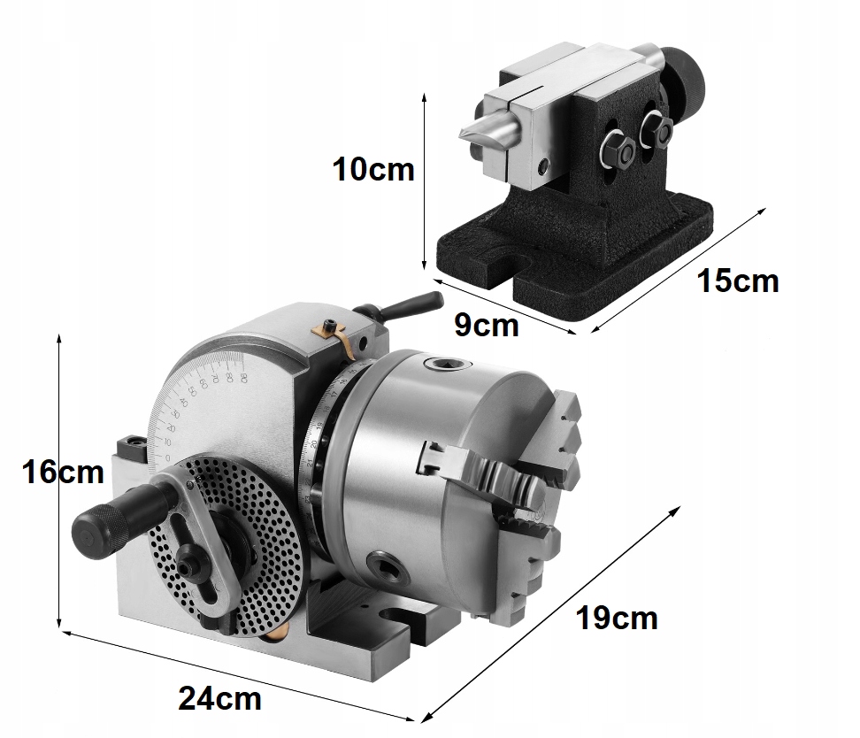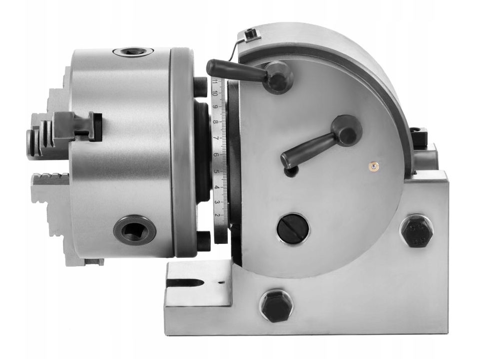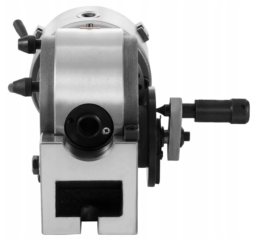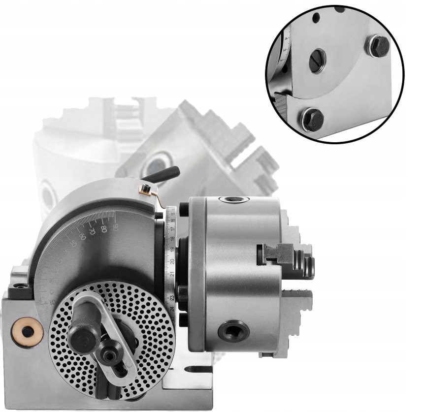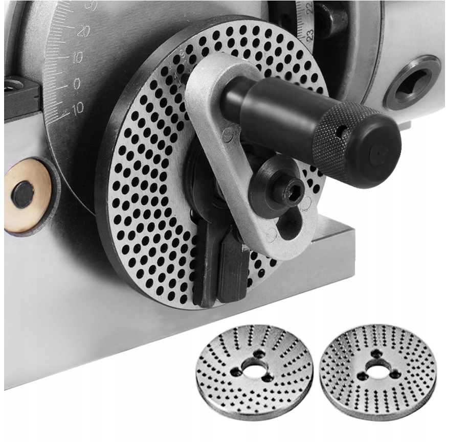 Повертаючи 1-й рівень, який висуває шпильку, шпилька входить у пластину, і ви можете розділити повне коло на 2, 3, 4, 6, 8, 12 або 24 частини. Другий рівень запобігає вібрації шпинделя під час обробки.