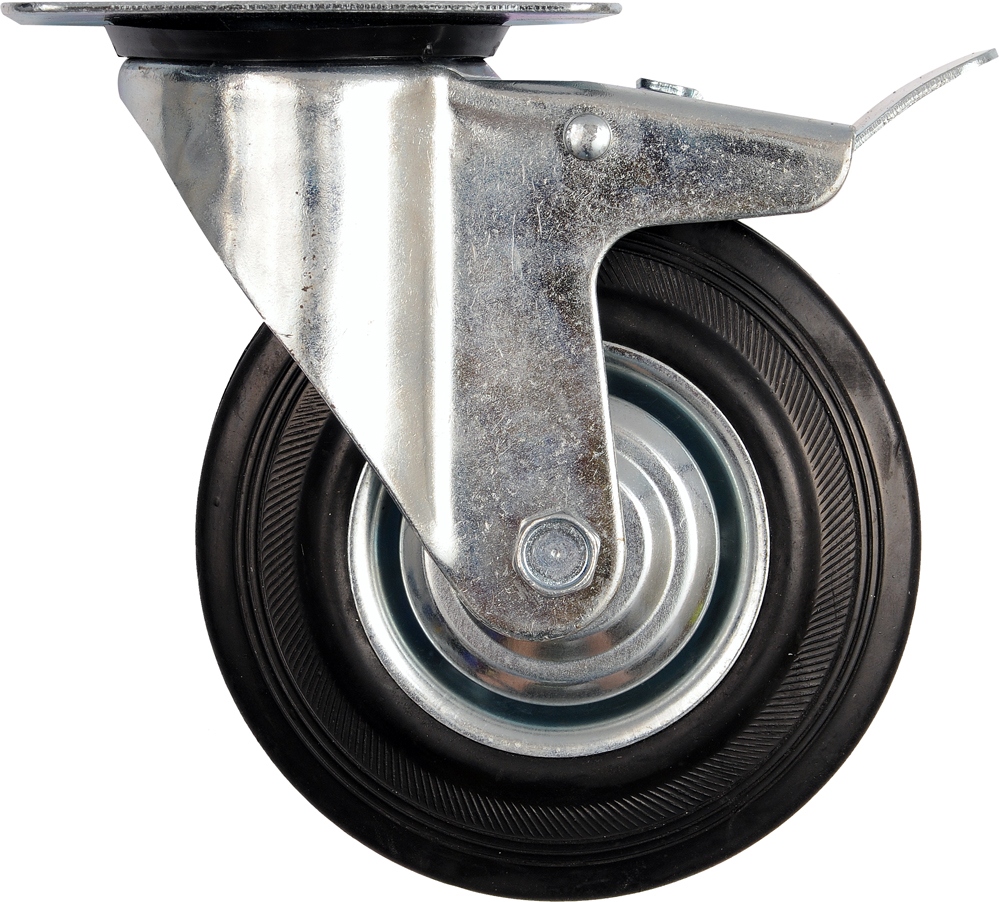 Колесо діаметром 100 мм з поворотним кріпленням, підшипники, з гальмом, шина з чорної гуми, висота 97 мм.