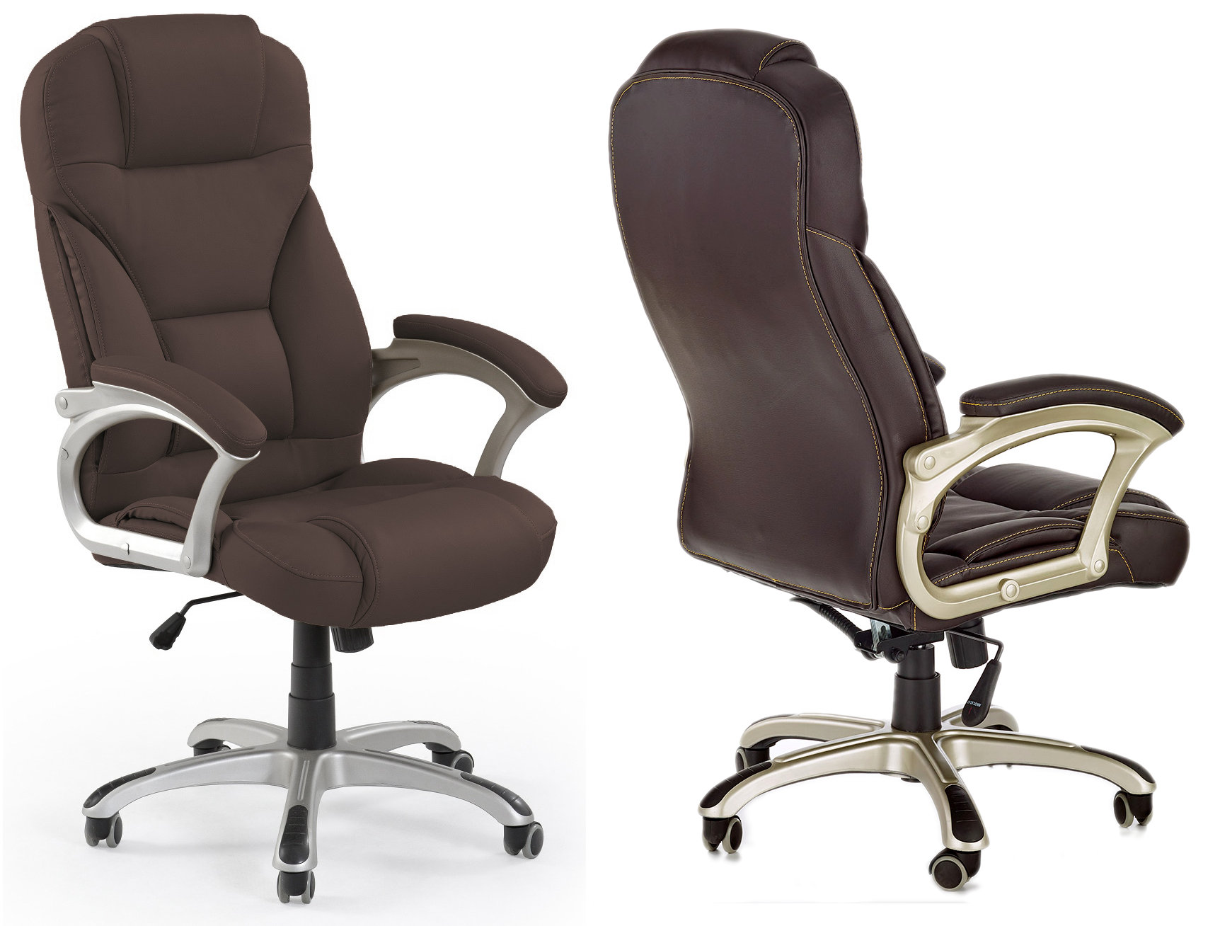 Дуже елегантне офісне крісло з профільованою спинкою. Підлокітники з м'якими м'якими накладками і ходовою основою з міцного сіро-золотистого пластику. Повністю оббитий екошкірою - легко підтримувати в чистоті. Має контрастну строчку - жовтий колір ниток (на деяких фото не видно). Оснащений механізмом руху MULTIBLOCK з функцією гойдання та фіксацією сидіння та спинки в кількох положеннях.