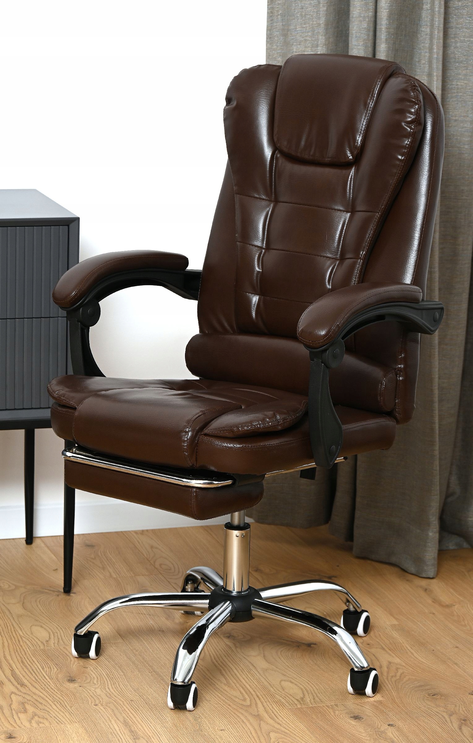 Поворотне офісне крісло з екошкіри з підставкою для ніг, хромована основа коричневого кольору