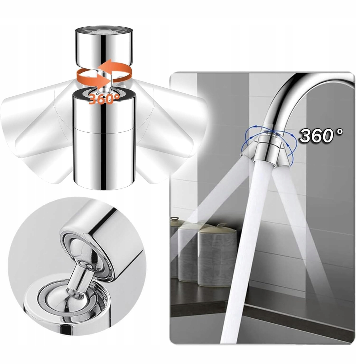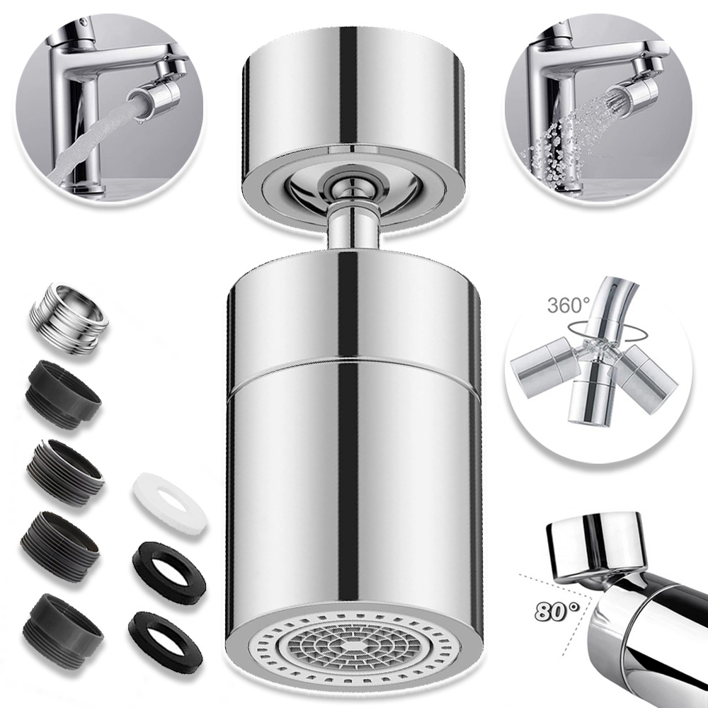 Максимальний кут нахилу вгору і вниз може досягати 80 градусів, а обертання 360 градусів дозволяє воді протікати до всіх куточків раковини, що дуже комфортно при промиванні і не викликає накопичення бруду. Повний діапазон руху дозволяє легко промити/очистити мийку, що дозволяє швидко очистити різні предмети в кутах раковини, тим самим підвищуючи ефективність очищення кухні.