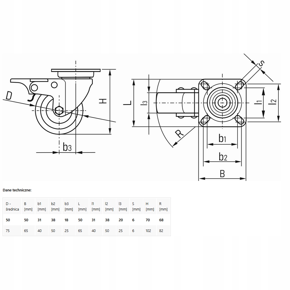 Поворотне колесо з фіксатором, діаметр 50 мм або 75 мм