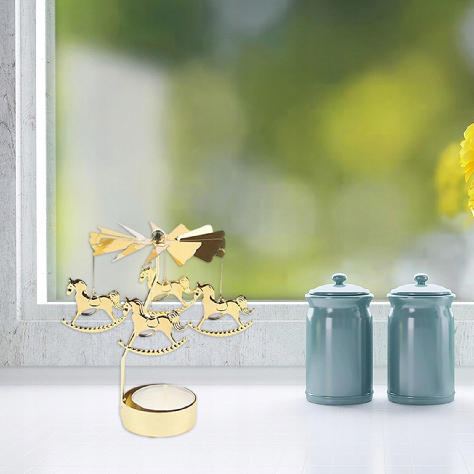 Високоякісний матеріал металу, міцний і простий у встановленні. Дизайн дозволяє безкоштовно розміщувати обертовий свічник на полиці для зберігання. Прикраси відображатимуть світло і розкине їх по сусідніх стінах та стелях. Він дуже підходить для романтичних унікальних вечорів. Його можна використовувати як подарунок для друзів, які люблять свічники. Примітка: без свічок)