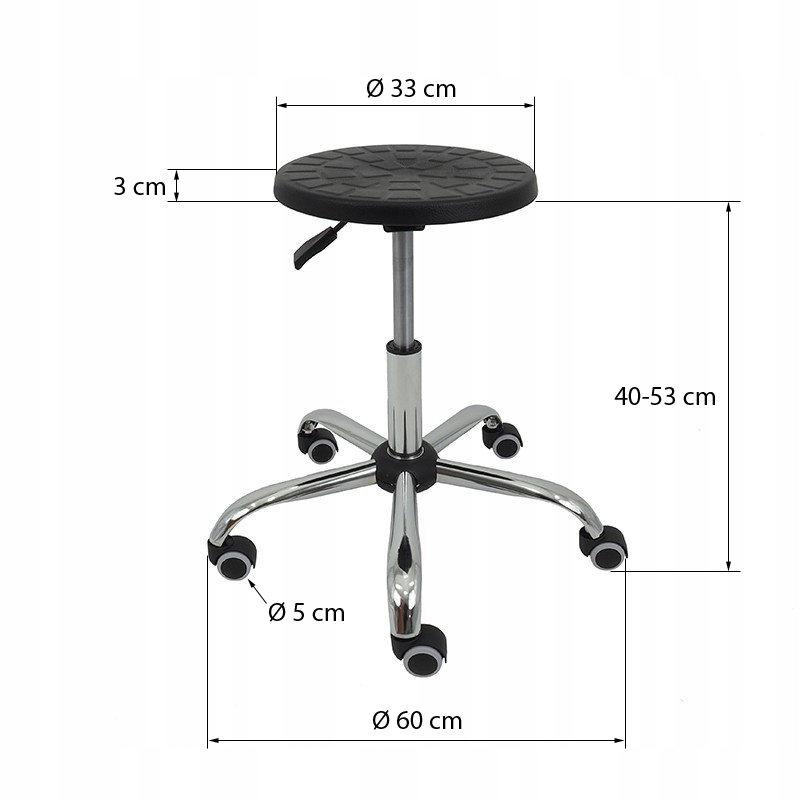 Цей універсальний робочий стілець із низьким приводом і круглим поліуретановим сидінням призначений для роботи на стандартній висоті. Ідеально підходить для майстерень, лабораторій, офісів і технічних майстерень.