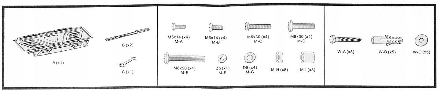 - Набір містить набір кріпильних гвинтів для стіни та для кріплення телевізора та польську інструкцію зі складання