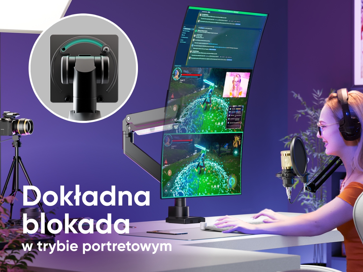 Рука ONKRON G130-B забезпечує повну гнучкість розташування екрана. Можливість нахилу від +90° до -45°, повороту на 180° і повного повороту на 360° дозволяють налаштувати екран у будь-якому положенні. Регулювання висоти 43 см і висота руки до 45 см означає, що монітор можна встановити в ідеальному положенні як горизонтально, так і вертикально. Це робить тримач ідеальним для роботи з багатьма програмами, проектуванням, аналізом даних або розвагами.