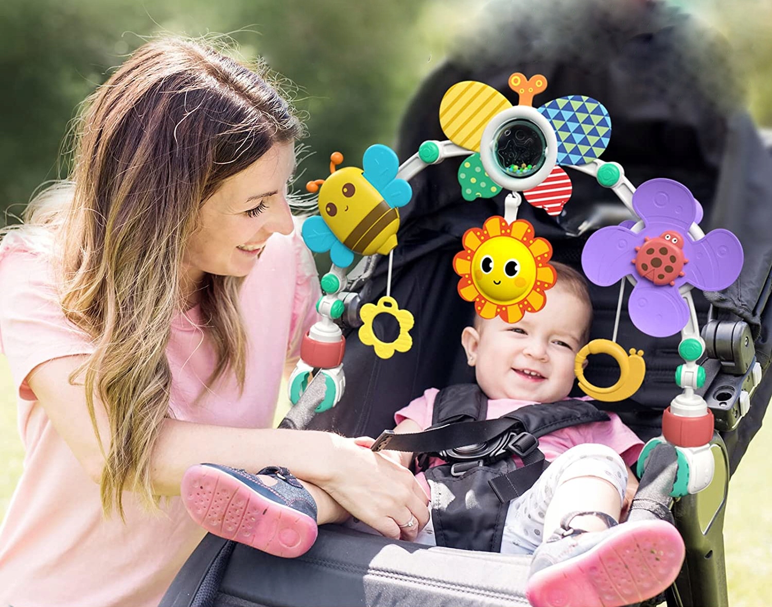 Бант - це універсальна іграшка, яка додасть шарму та розваги будь-якій колясці, автокріслу чи ліжку. Він надзвичайно гнучкий, тому його можна легко прикріпити практично будь-де. На пов'язці різні іграшки: вертушка з сонечком, яка обертається і вібрує при русі, сонечко, яке пищить при стисканні, метелик-брязкальце з прозорою кулькою, в якій стрибають різнокольорові кульки і шарудить матеріал, підвіска-равлик і квітка, яка може служити прорізувачем. Кожна з цих іграшок має різну текстуру, яка стимулює відчуття дотику дитини та допомагає розвивати її моторику.
