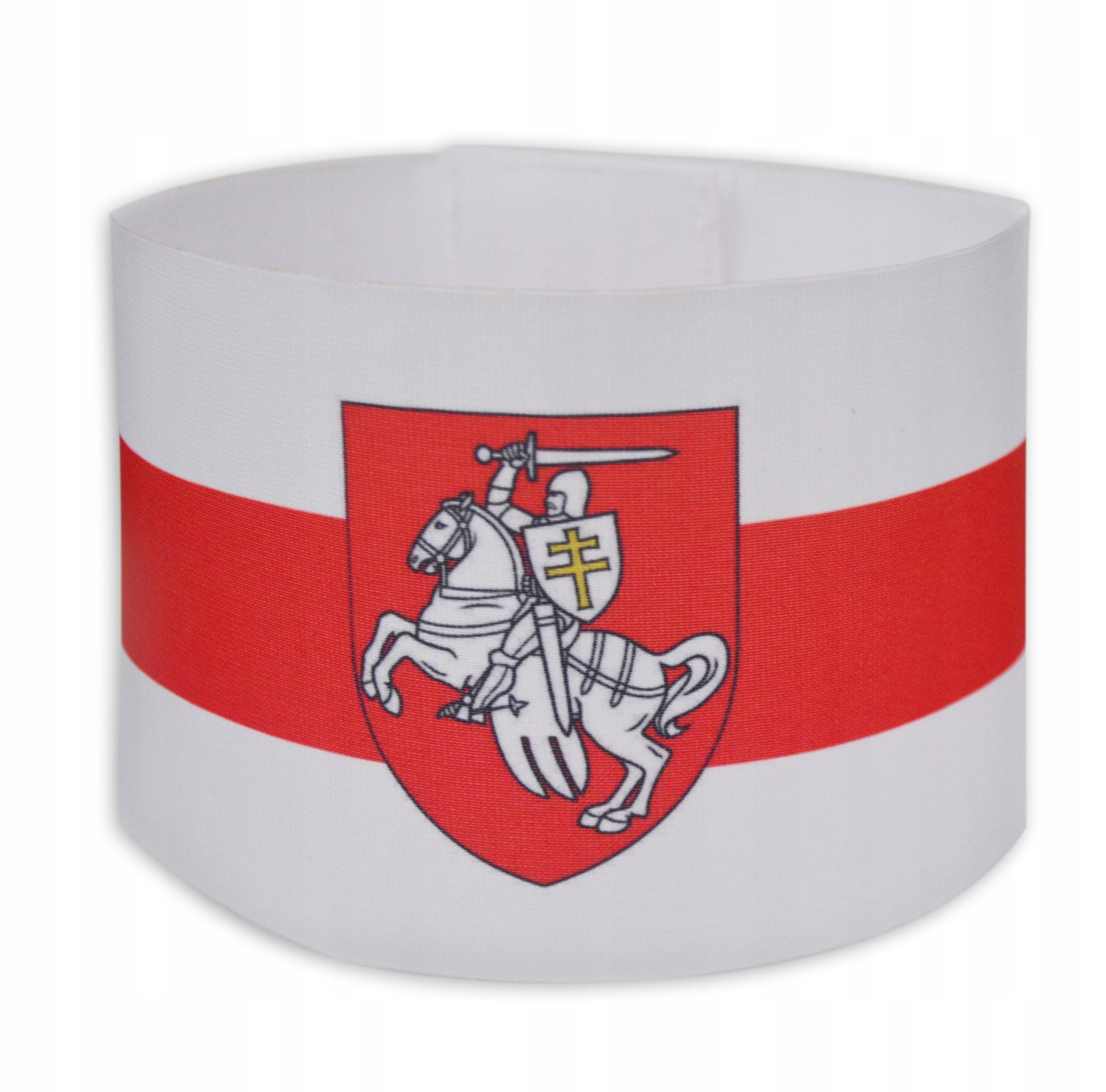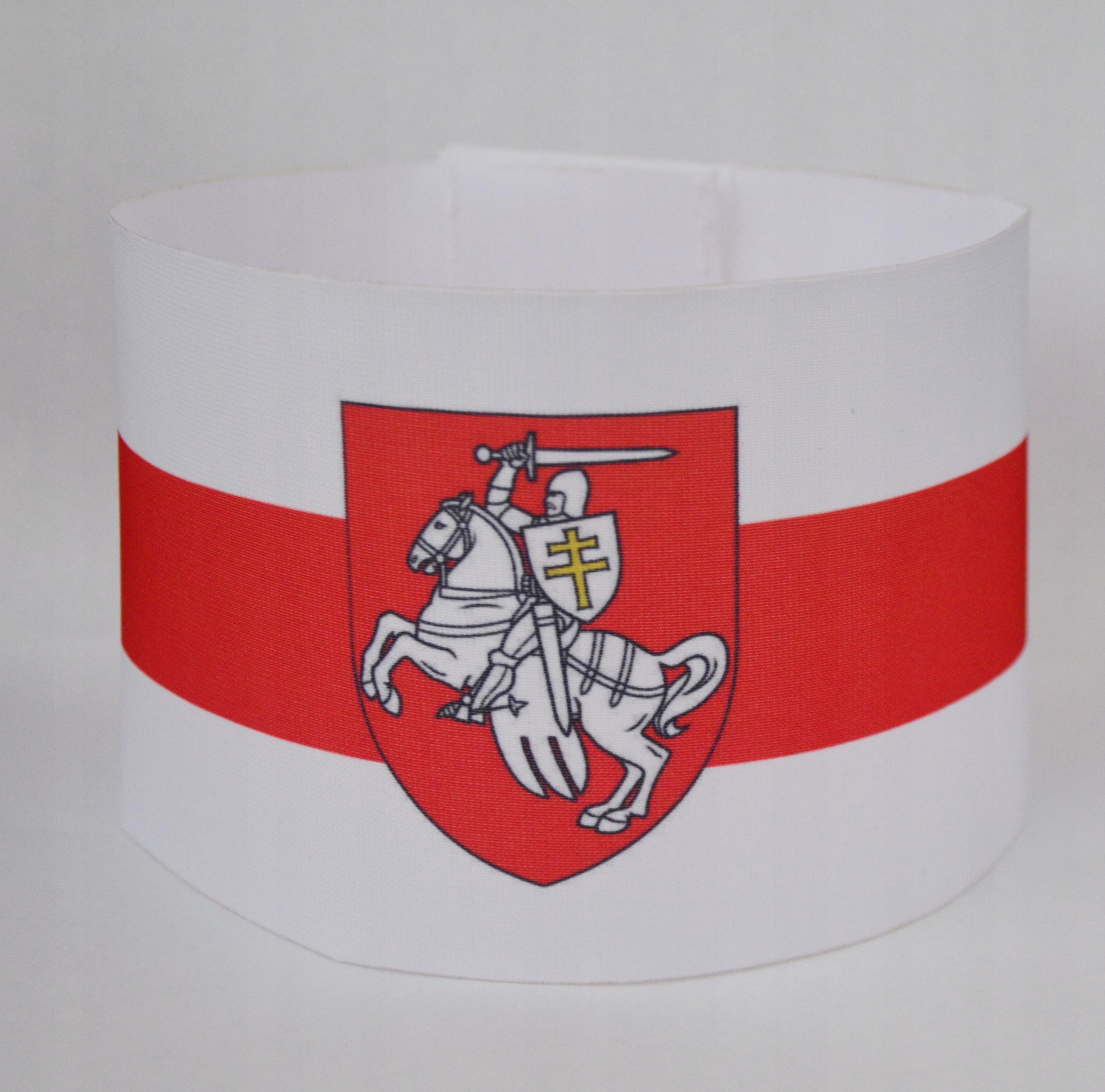 Біло-червоно-біла пов'язка з історичним гербом Білорусі шириною 10 см, обхватом 38 см і довжиною 44 см