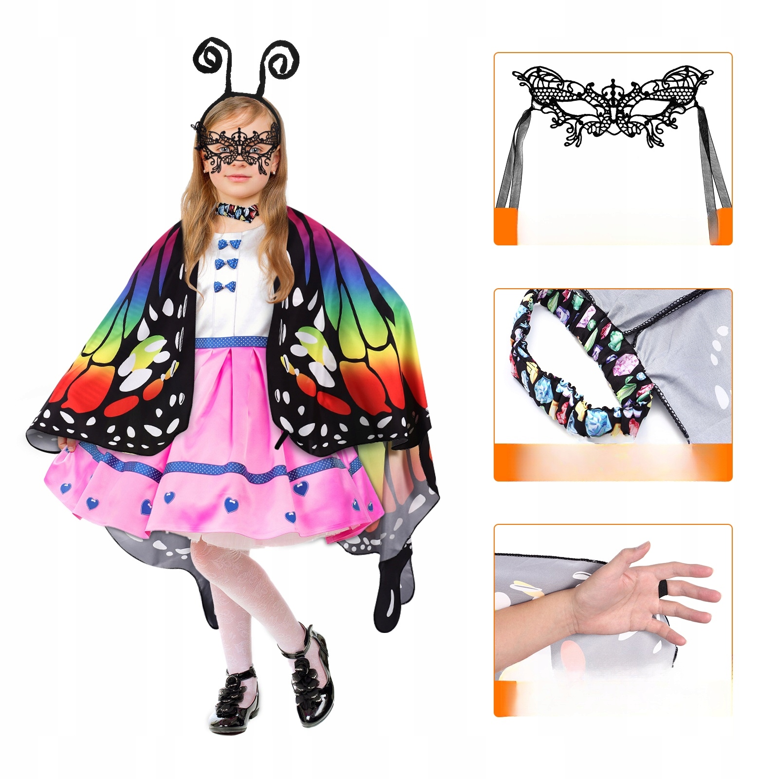 ✅Ідеальна сукня, барвиста накидка з метеликами, пов'язка з метеликами та чорна мереживна маска, завдяки якій ваші діти виглядатимуть справжніми метеликами, гарними та чарівними. p >