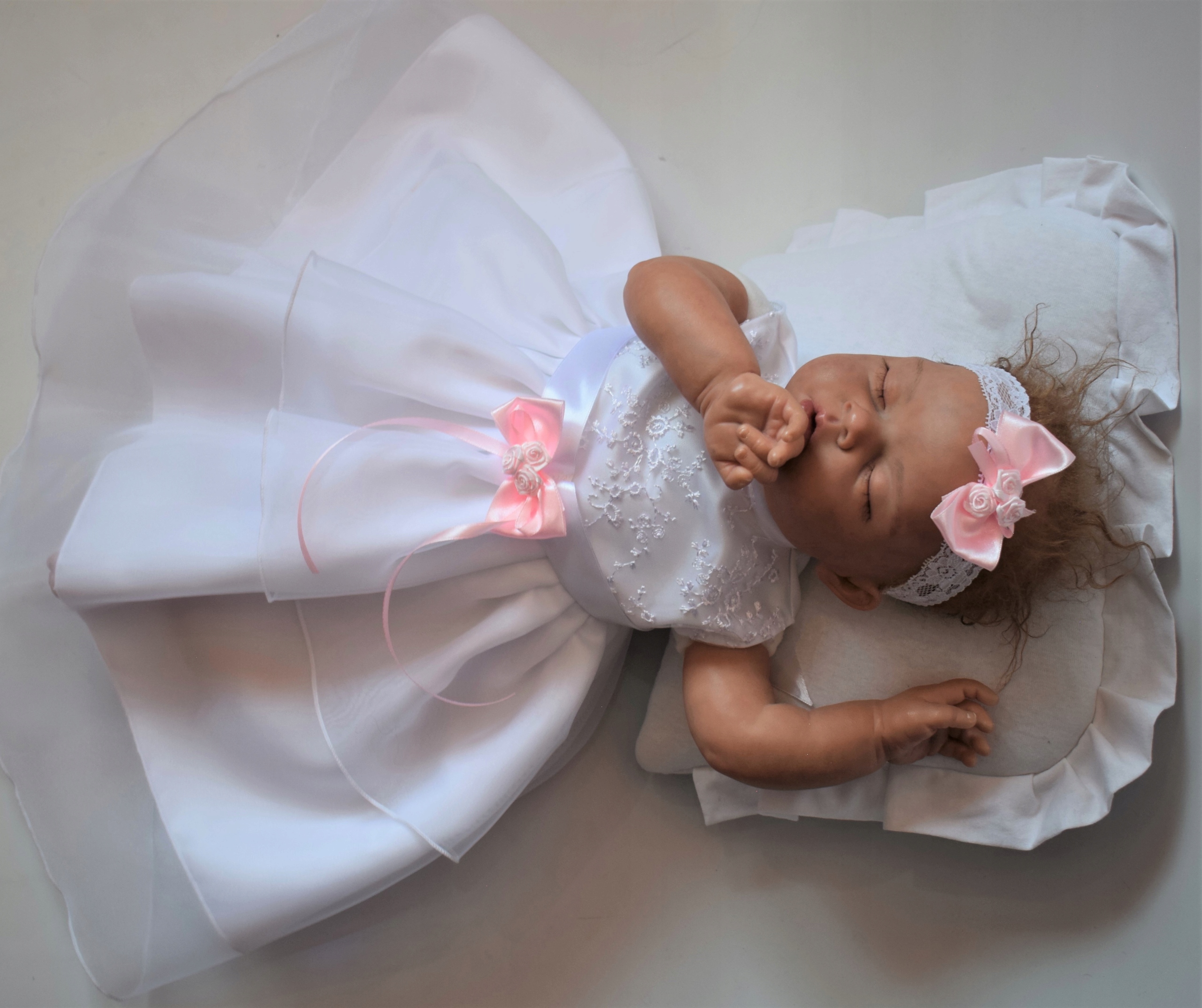 верх - з атласу та ніжного мережива, без рукавів, зав'язується на талії стрічкою, прикрашена троянда та бант ручної роботи, застібка ззаду