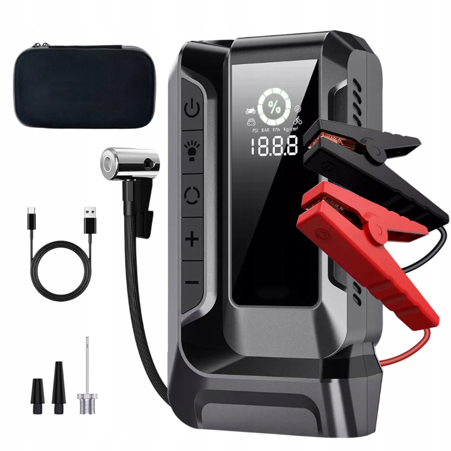 - Автомобільний стартер Q16 оснащений ефективним 1200-ампним-демператором та компресором повітря з тиском 150 фунтів на дюйм, завдяки якому милить око, ви почнете автомобіль і надуває трики. Або шукайте найближчу АЗС, щоб надути шини. Оснащений вдосконаленими функціями безпеки. Ночі. Це повний пакет з дивовижними функціями. Powerbank для аварійного початку автомобіля Q16 також може використовуватися як портативний Powerbank, тому ви можете заряджати мобільні пристрої під час подорожі. Накачання та інші важливі дані, завдяки яким використання продукту простіше та прозоріше.