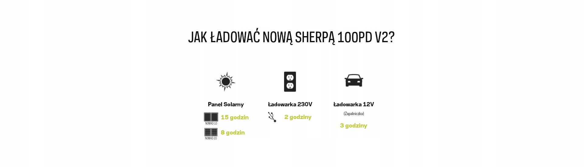 Блок живлення Goal Zero Sherpa 100PD V2 можна заряджати за допомогою будь-якого джерела живлення. Від електричної розетки вдома/в офісі (включаючи використання швидкого зарядного пристрою 45 Вт). Однак найбільшою перевагою Sherpa 100PD V2 є його адаптація до заряджання від фотоелектричних панелей. Ви можете використовувати портативні панелі серії Nomad для цього в екологічний, ефективний і, перш за все, дуже простий спосіб.