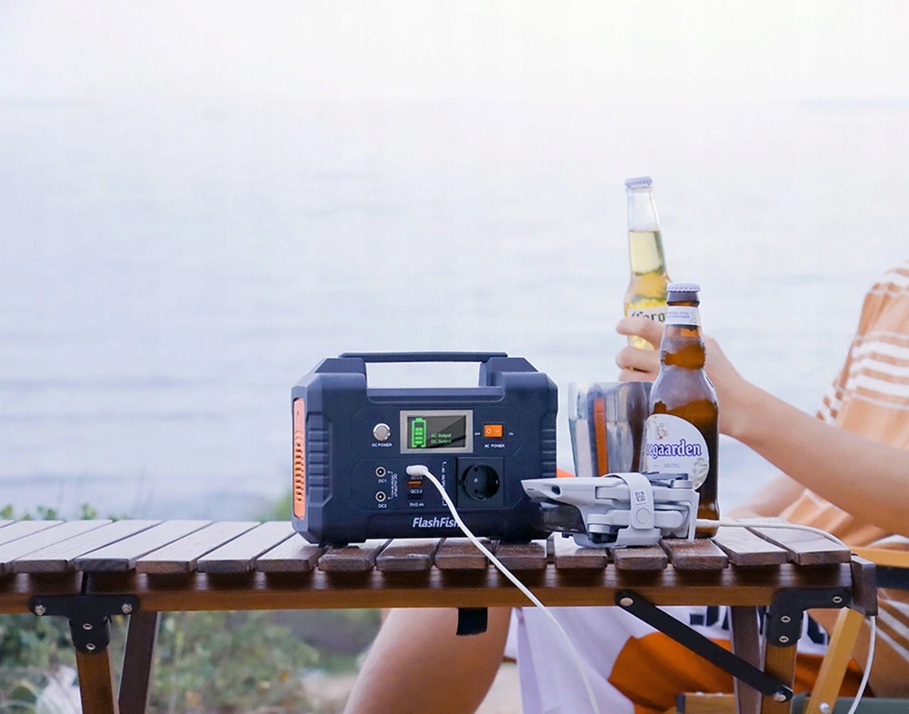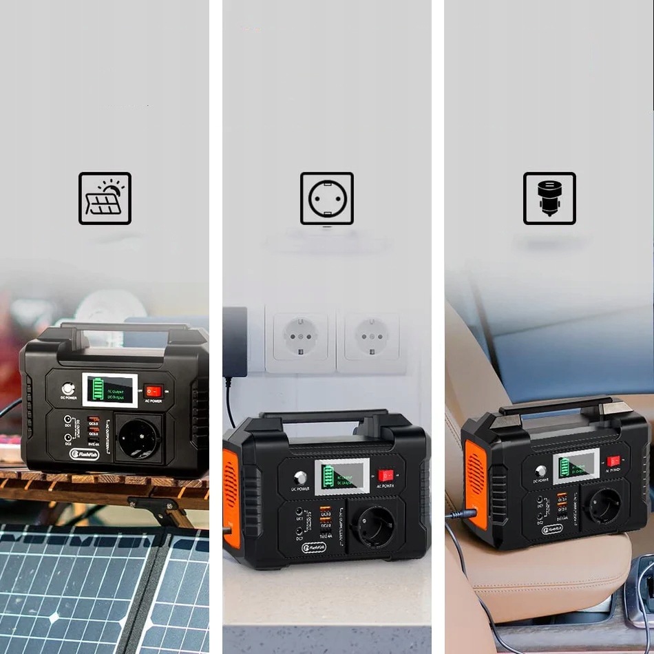 FlashFish Power Station оснащено літієвою батареєю, яку можна заряджати від сонячної панелі 15–24 В/розетки змінного струму/автомобільної розетки, що дає вам більше гнучкості в дорозі . Багатофункціональний надяскравий РК-екран пропонує інтуїтивно зрозуміле та чітке відображення стану заряду/заряджання/розряду батареї/виходу змінного струму/виходу постійного струму навіть за слабкого освітлення.