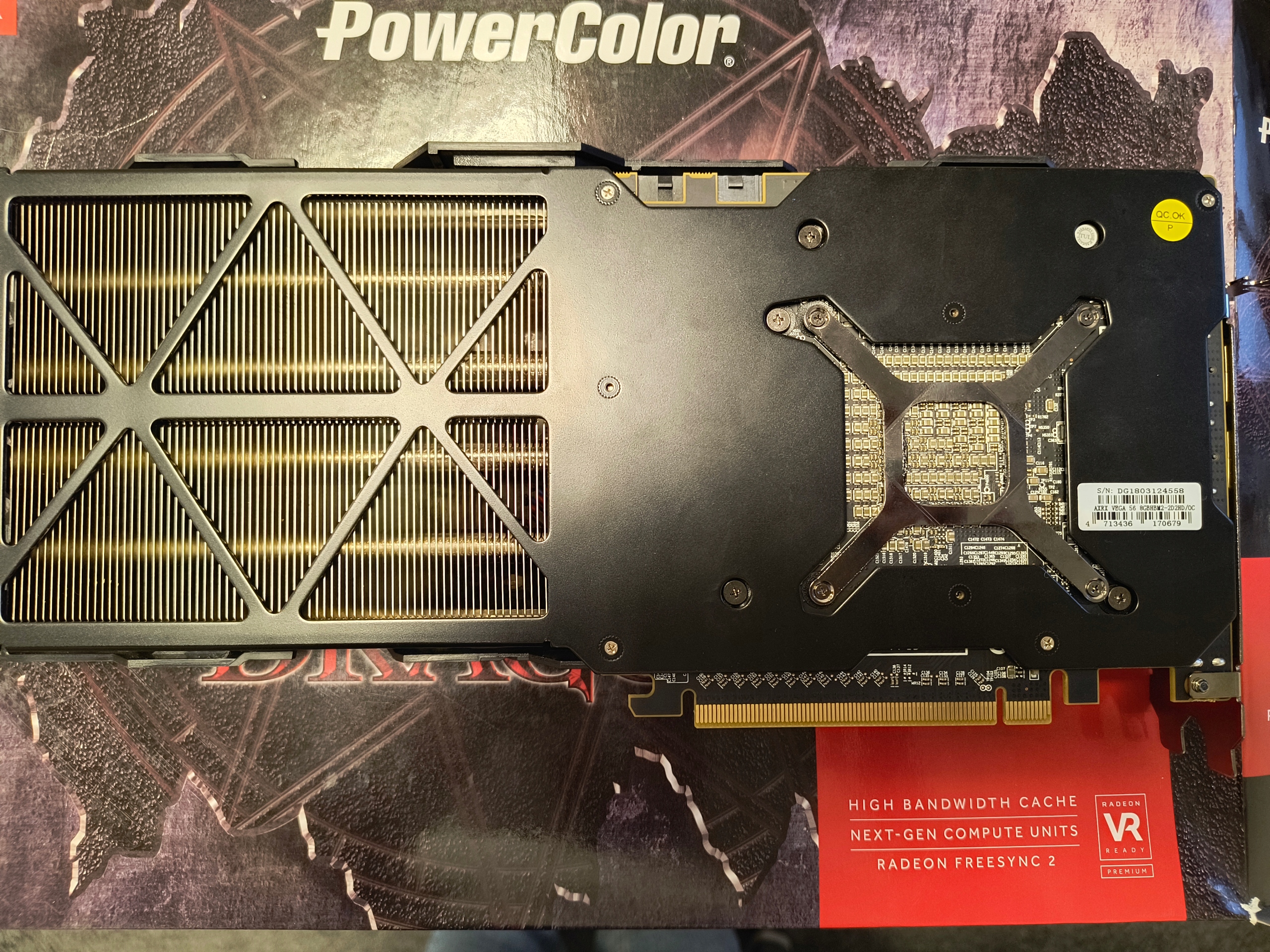 PowerColor Radeon RX Vega 56 Red Dragon — це відеокарта, що працює на частоті до 1478 МГц. Еталонні моделі можуть досягати 1471 МГц, тому суто теоретично ми маємо справу з розігнаною моделлю компанії. Система оснащена 8 ГБ оперативної пам'яті HBM2 з тактовою частотою 800 МГц (1,6 Гбіт/с). Система охолодження складається з трьох вентиляторів, теплових трубок і суцільного радіатора. Також була пластина жорсткості. Виробник хвалиться тим, що Radeon має перемикач BIOS, який дозволяє змінити режим розгону на безшумний режим, у якому карту буде майже нечутно навіть під час екстремальних ігор.