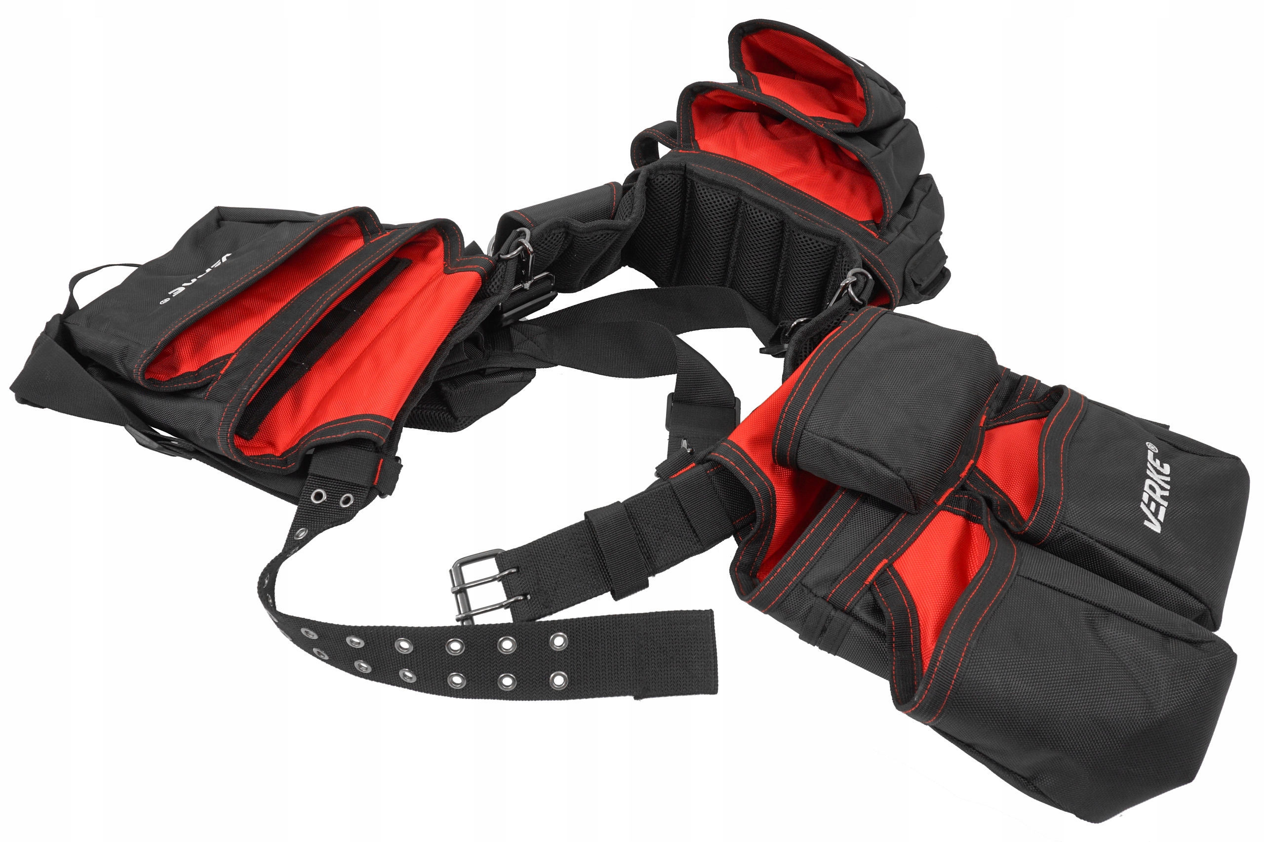 Ремінь для інструментів із трьома висувними мішками з численними кишенями та петелькою для молотка. Міцний ергономічний ремінь, що застібається на металеву пряжку. У комплекті є тримачі для кріплення ременів і регульовані ремені. Матеріал: поліестер 1680D. Тканини з переплетеннями 1680D є одними з найбільш міцних і довговічних матеріалів. Щільна граматура забезпечує виробам виняткову міцність і стійкість до різного роду механічних пошкоджень. Тканини характеризуються чіткою структурою плетіння та мають додаткове PU покриття. Такий спосіб просочення зміцнює матеріал і надає тканині властивості захисту від бризок. Для транспортування та зберігання інструментів на робочому місці.