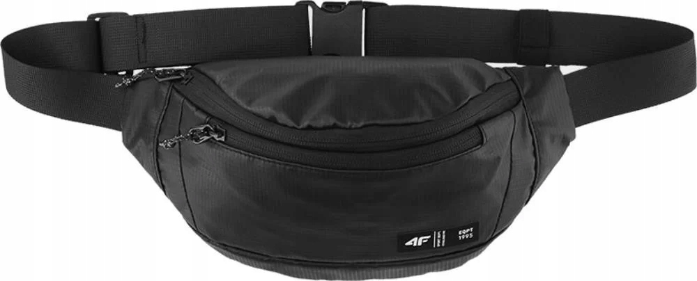 Чорна сумка на пояс від 4F. Поясна сумка має дві кишені на блискавці. У більшу з легкістю поміститься гаманець, а в меншу можна помістити дрібниці. Спереду є нашивка з логотипом і характерними для бренду написами. Стегновий ремінь регулюється і застібається на зручну пластикову засувку. Крім того, завдяки подовженню ремінця сумку можна модно повісити через плече по діагоналі. Великою перевагою сумки є невелика вага, що підвищує комфорт при носінні.