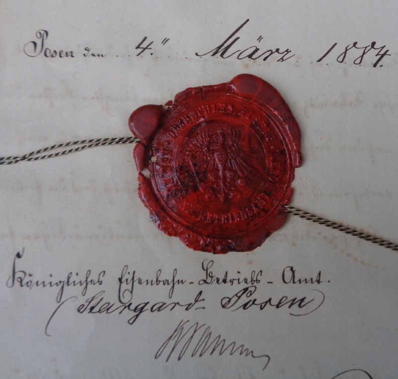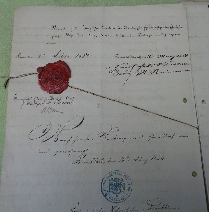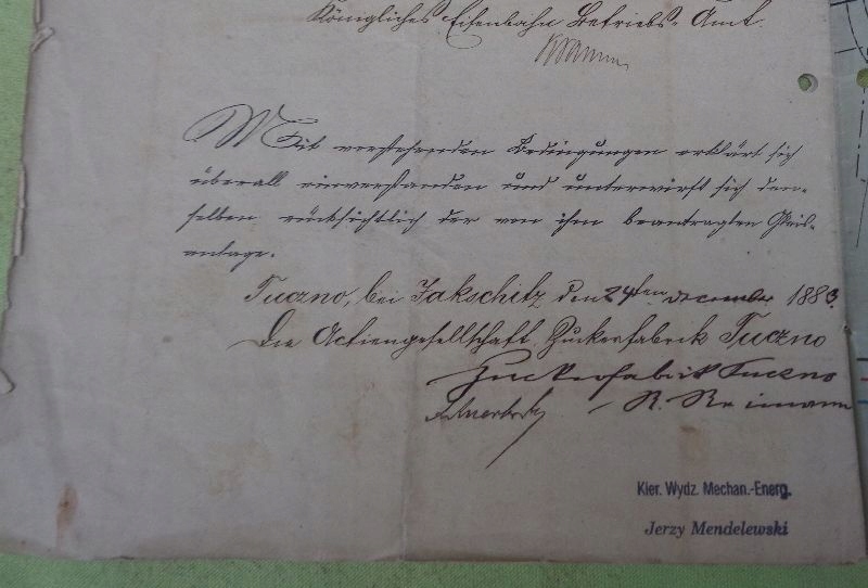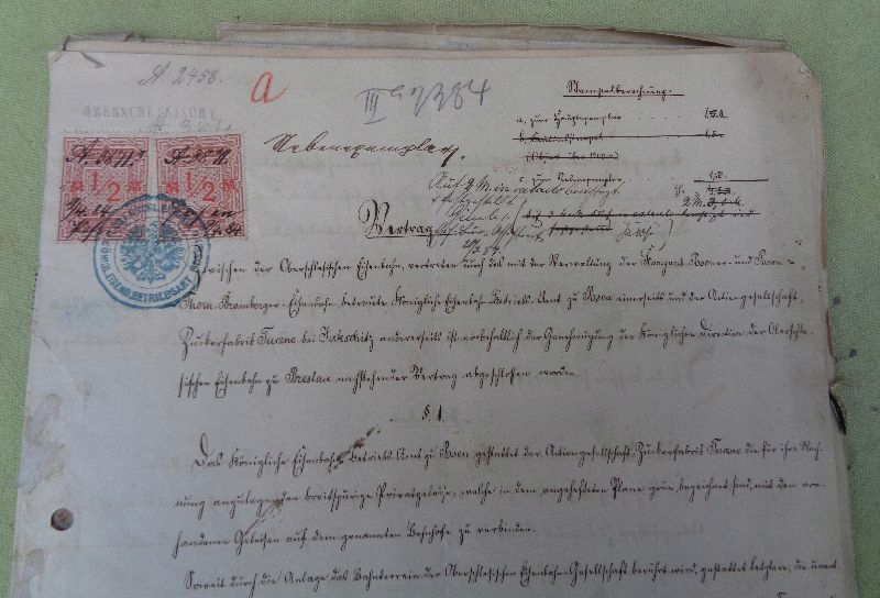Прекрасний, унікальний, колекційний дозвіл на будівництво вузькоколійної залізниці для цукрового заводу Тучно, гміна Злотники Куявські, з 1884 року. Весь експонат описано вручну. Виставку готували в Познані. Документ містить оригінальну сургучну печатку установи, яка видає дозвіл і знаходиться в Познані. Документ також містить печатки інших керівних установ з Познані, а також печатку затверджувальної установи з Вроцлава. Документ також містить оригінали власноручних підписів посадових осіб. Документ також супроводжується картою залізничної лінії Тучно цукрового заводу, складеною картографічним заводом у Познані з 1883 року. Документацію супроводжує набір із 7 гербових марок з оригінальною печаткою Познанської пошти. Документ складається з восьми письмових карток. Рекомендую цей унікальний, унікальний експонат для колекціонерів.