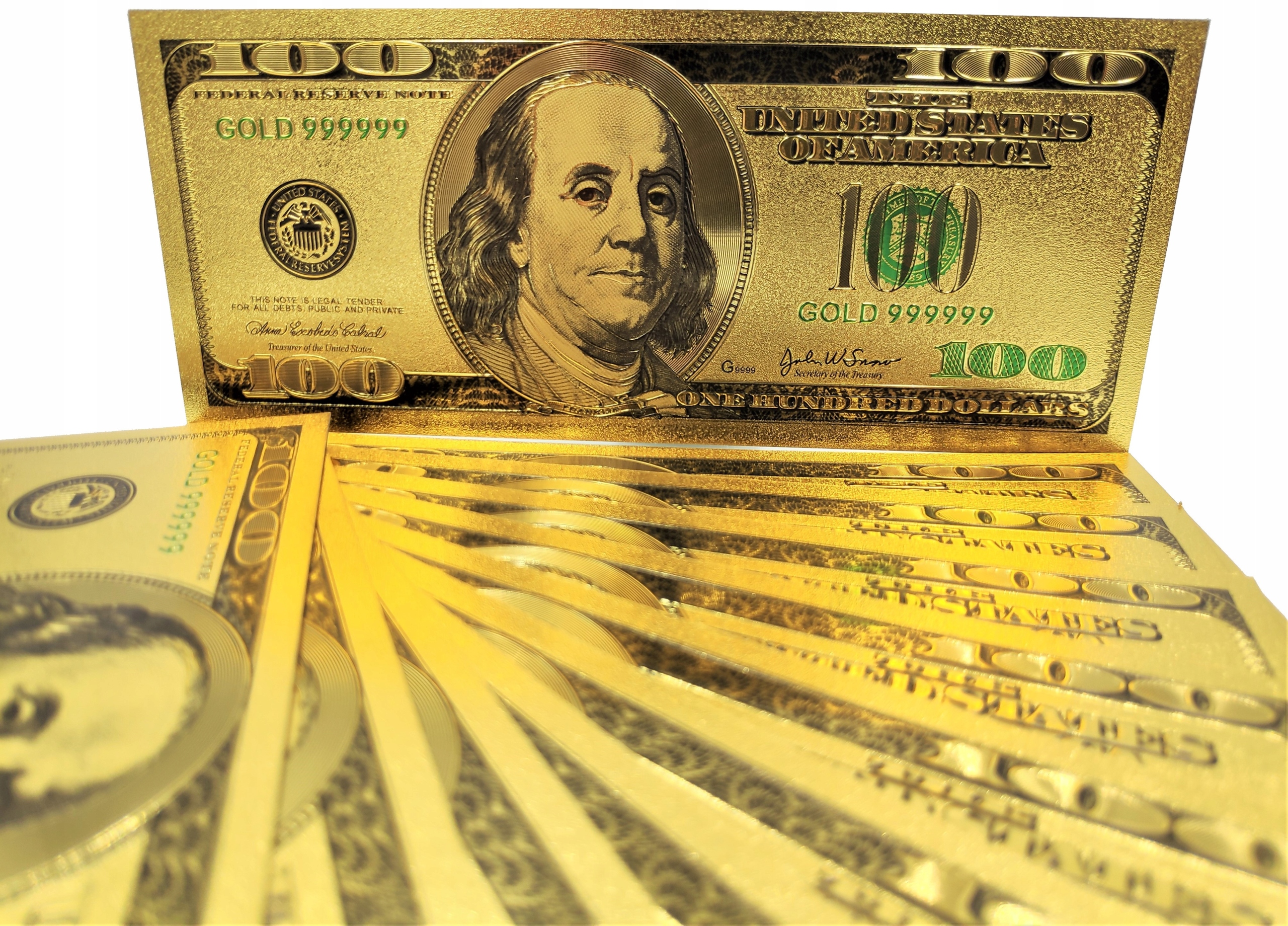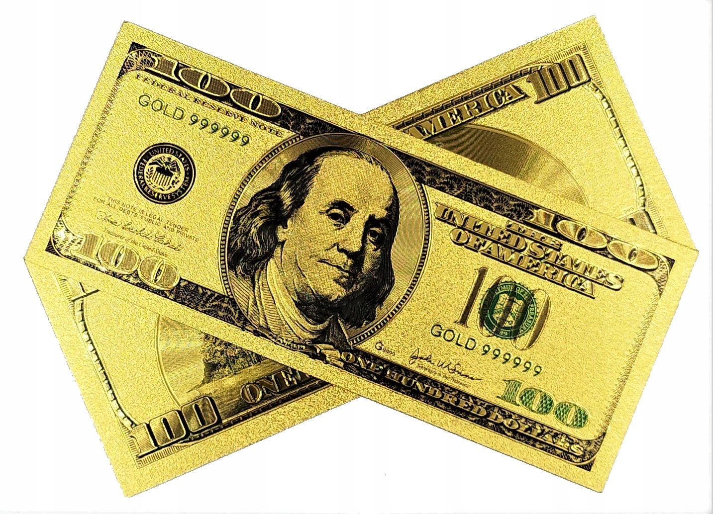 Це точна копія американської обігової банкноти у версії до 2009 року, виготовлена з ПВХ та покритий золотою фольгою.