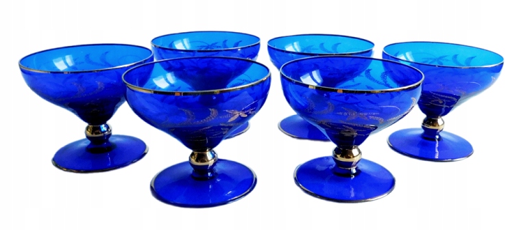 Еукціонний предмет - це набір з 6 окулярів, видимого на фотографії. Їх привезли з Німеччини - купили в Тродельхаллі для колекціонерів. Зроблено зі скла в кобальтовому кольорі, рукотвореним з позолотою. Стан, як на фотографії.